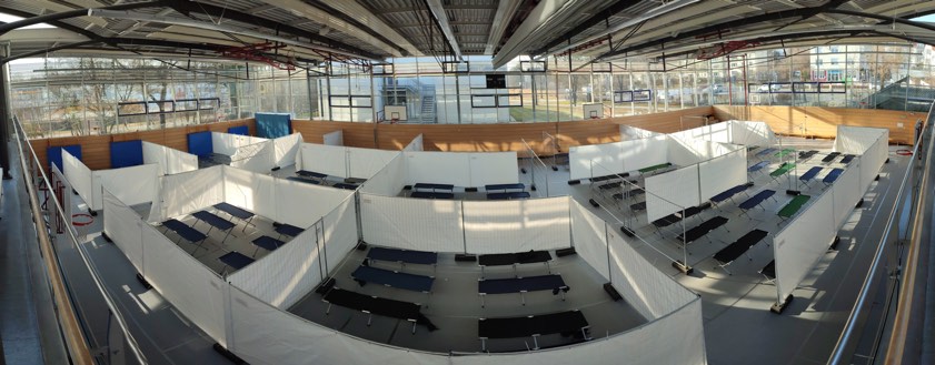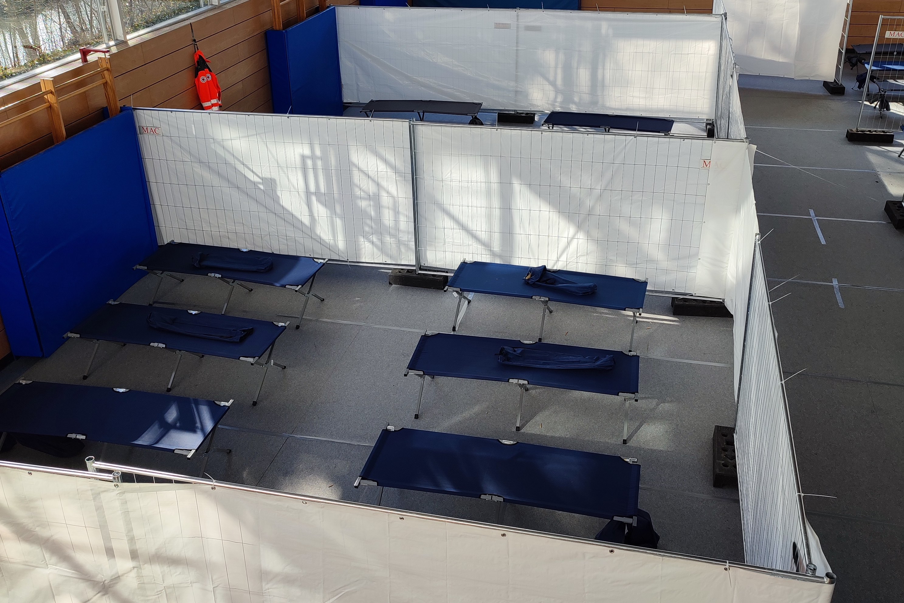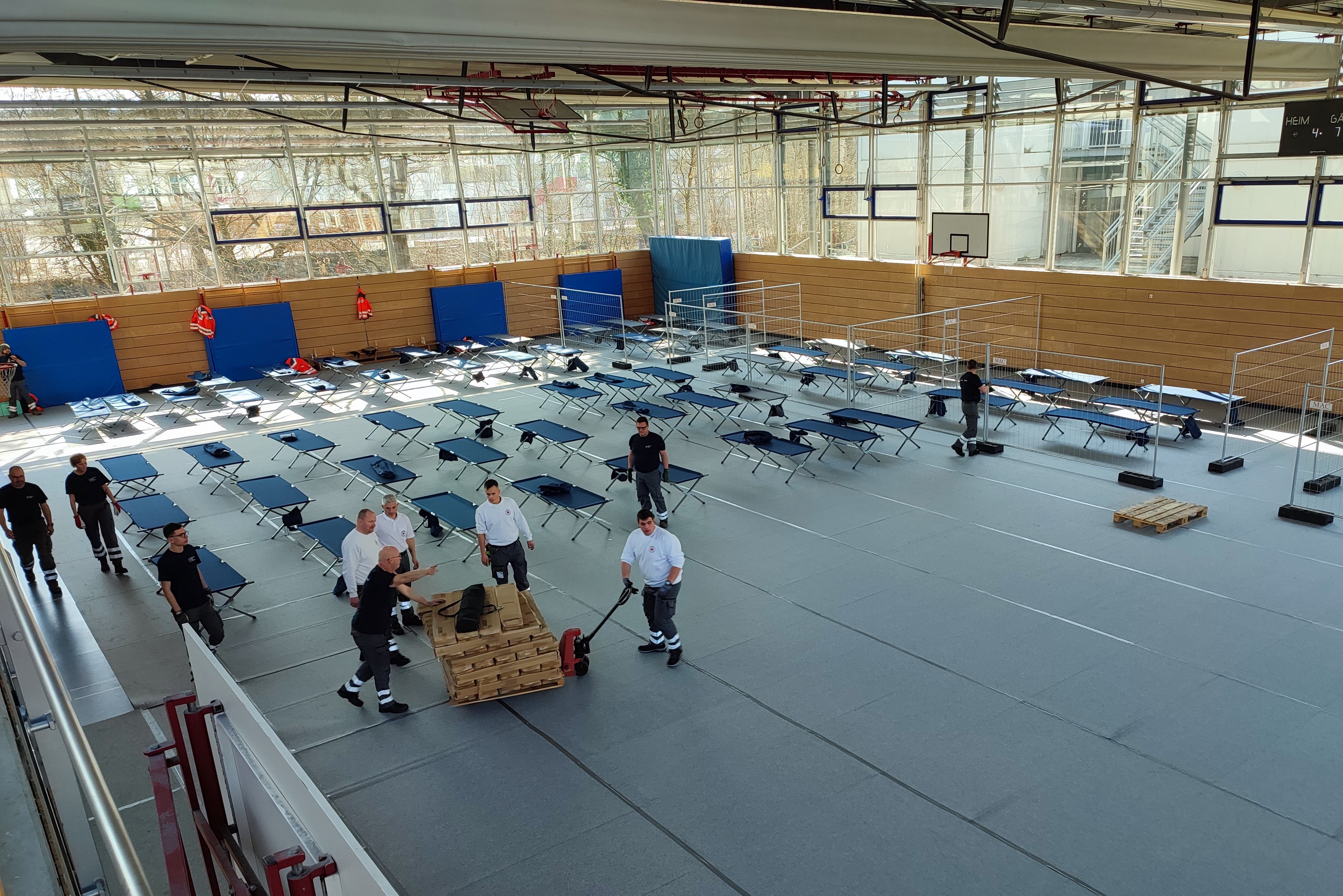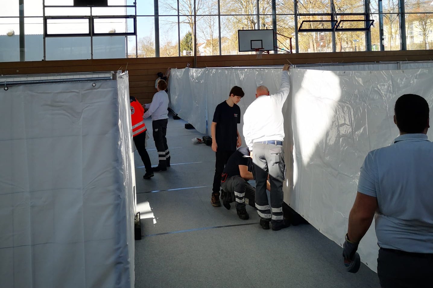 Hier ist Platz für rund 100 Leute. BRK-Helfer haben die notwendigen Vorbereitungen getroffen und die Aufbau-Arbeiten erledigt.