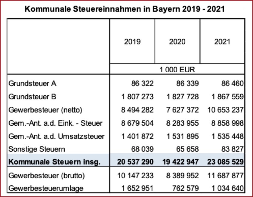 (ty) Nach den Ergebnissen der vierteljährlichen kommunalen Kassen-Statistik haben die bayerischen Gemeinden und Gemeinde-Verbände im vergangenen Jahr 18,9 Prozent mehr Steuern eingenommen als noch im Jahr zuvor (siehe auch Tabelle unten). Die kommunalen Steuer-Einnahmen betrugen im Jahr 2021 insgesamt 23,09 Milliarden Euro – im Vergleich zu 19,42 Milliarden Euro im ersten Corona-Jahr 2020. Sie lagen damit um 12,4 Prozent über dem Vor-Krisen-Niveau von 2019. Damals betrugen die Steuer-Einnahmen der bayerischen Kommunen 20,54 Milliarden Euro.