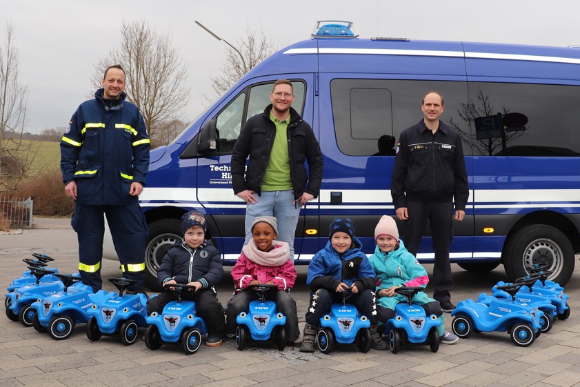 (ty) Die städtischen Kindertagesstätten in Pfaffenhofen haben vom hiesigen Technischen Hilfswerk (THW) insgesamt 13 Bobby-Cars erhalten. Michael Matthes vom THW und der Pfaffenhofener Ortsbeauftragte des THW, Alexander Müller, übergaben die Spende in der Kita "St. Andreas" (Foto oben). Die Leiterin dieser Einrichtung, Anne Mela Gröhnke, und Daniel Riegel, der zuständige Sachgebiets-Leiter bei der Stadtverwaltung, nahmen die Spende entgegen. "Die Fahrzeuge werden auf die acht städtischen Kitas aufgeteilt", teilte die Stadtverwaltung mit. Die ersten Buben und Mädchen durften die kleinen blauen Gefährte mit dem THW-Schriftzug auch gleich ausprobieren.