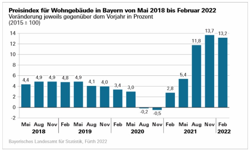 (ty) Der Preis-Index für den Neubau von Wohngebäuden im Freistaat hat im Februar dieses Jahres einen Stand von 137,3 erreicht (2015≙100). "Im Vergleich zum entsprechenden Vorjahres-Monat entspricht dies einer durchschnittlichen Preissteigerung von 13,2 Prozent", teilte das bayerische Landesamt für Statistik heute mit (siehe auch Grafik unten). Im Bereich der Rohbau-Arbeiten klettern die Preise im Vorjahres-Vergleich um 12,6 Prozent.