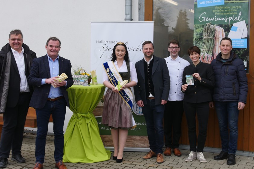 (ty) Die ersten wärmenden Sonnenstrahlen im Frühling lassen das edle Stangengemüse sprießen. Landrat Albert Gürtner (FW), der Manchinger Bürgermeister Herbert Nerb (FW), die Schrobenhausener Spargelkönigin Annalena I., der Kreisvorsitzende des bayerischen Hotel- und Gaststätten-Verbands, Christian Reichart, sowie Andreas Regensburger und Britta Lemloh vom Kommunal-Unternehmen für Struktur-Entwicklung im Landkreis (KUS) haben zusammen mit Spargel-Erzeuger Christoph Weichenrieder aus Manching die diesjährige Spargel-Saison im Kreis Pfaffenhofen eröffnet.