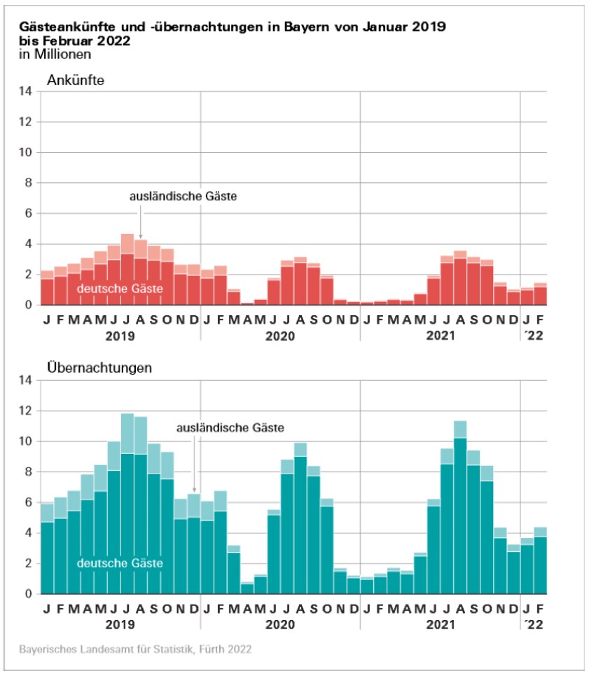 An der Zusammensetzung dieser Daten im Hinblick auf die Herkunft der Gäste änderte sich auch in diesem Monat wenig. So kamen im Februar dieses Jahres 81,6 Prozent der Gäste aus dem Inland (Februar 2021: 85,1 Prozent) und nur 18,4 Prozent aus dem Ausland (Februar 2021: 14,9 Prozent). Ähnliches auch bei den Übernachtungen: Hier trugen zu 85,4 Prozent inländische Gäste bei (Februar 2021: 84,5 Prozent), der Anteil ausländischer Gäste lag bei 14,6 Prozent (Februar 2021: 15,5 Prozent).