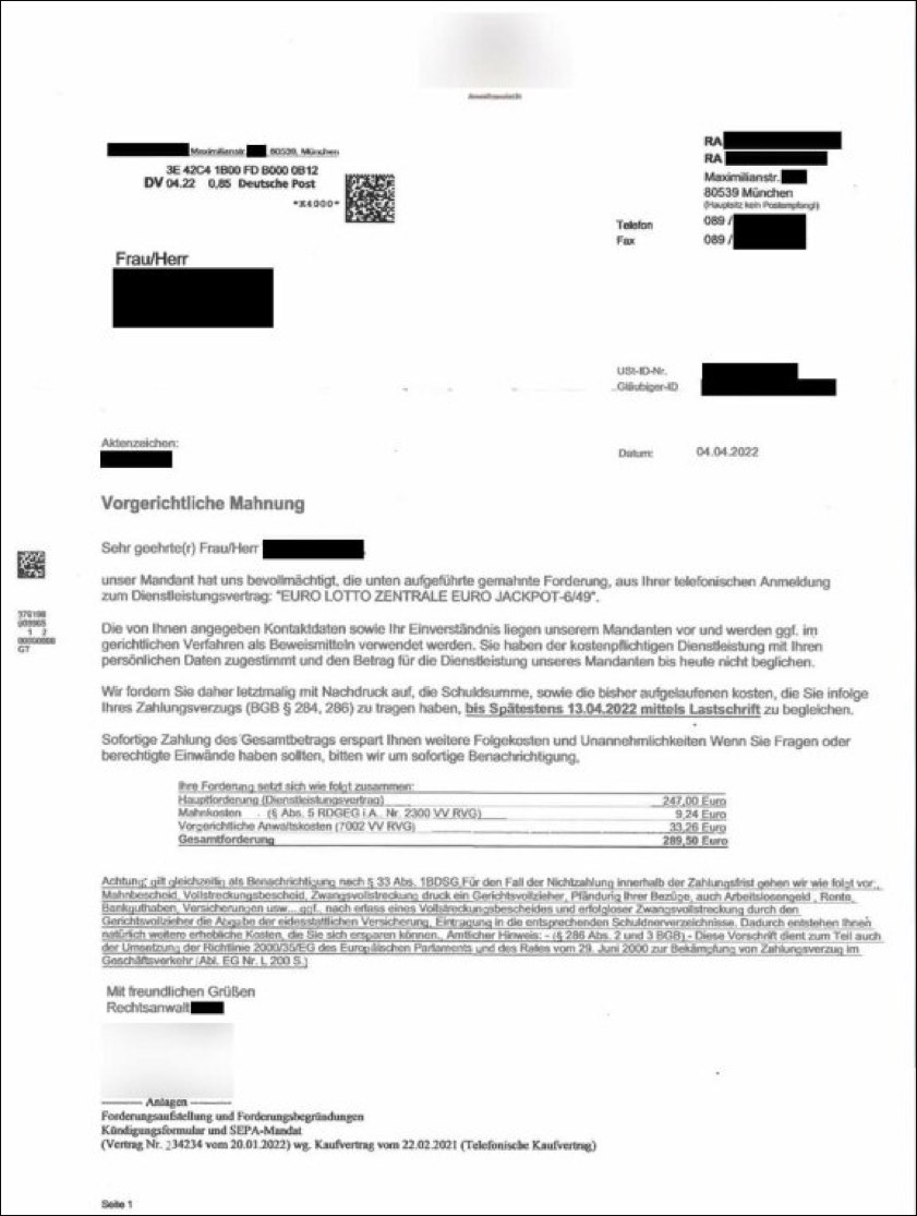 In den Briefen einer angeblichen Kanzlei aus München wird eine Zahlung per Lastschrift-Verfahren an eine "Euro Jackpot GmbH" gefordert.