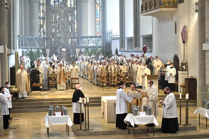 Bei der Chrisam-Messe im Augsburger Dom wurden heute die heiligen Öle zur Spendung der Sakramente geweiht. Priester erneuerten Bereitschaft zu ihrem Dienst.
