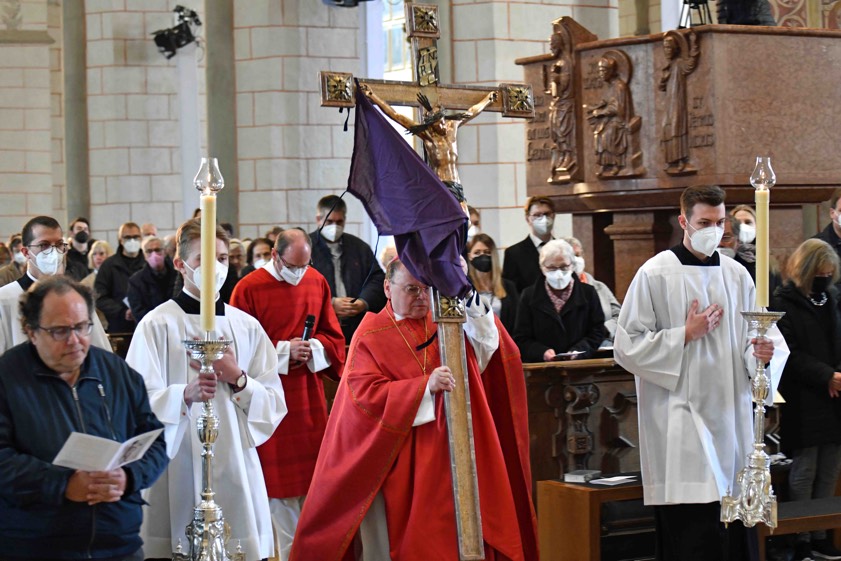 Er ermutigte die Gottesdienst-Besucher im Dom und vor den Bildschirmen dazu, die richtigen Schlüsse für ihr Leben und Glauben aus dem zu ziehen, was die Identität des Gekreuzigten und die eigene so wertvoll mache: "Wer sich Jesus, dem Herrn, zuwendet und seiner Spur folgt, braucht keine Angst mehr davor zu haben, dass er zu wenig Beachtung findet und kein Hahn mehr nach ihm kräht. Je mehr wir erkennen und bekennen, dass er es ist, desto klarer wird uns auch, wer wir sind: vom Herrn Geliebte und Erlöste. Und desto mehr werden wir dafür in Wort und Tat Zeugnis geben."