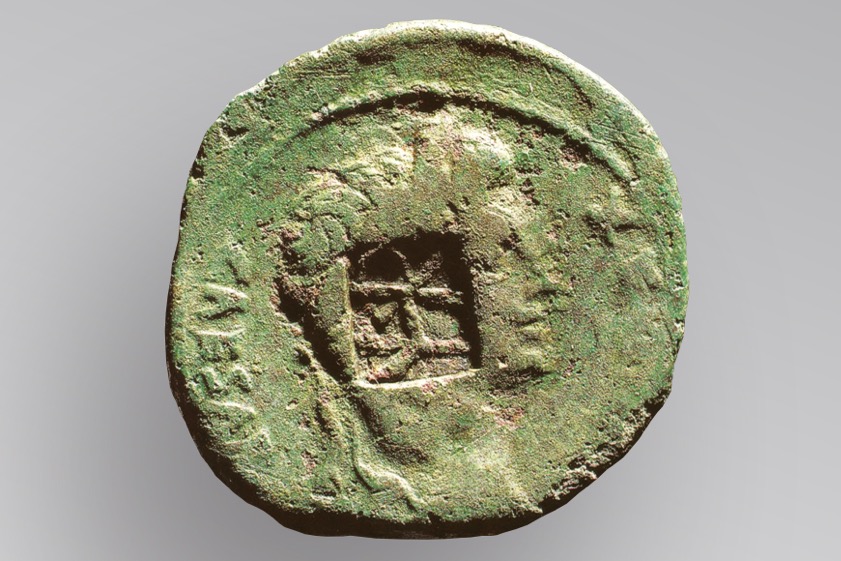 Die Kupfermünze vom Typ Lugdunum I trägt einen Gegenstempel des Publius Quinctilius Varus.