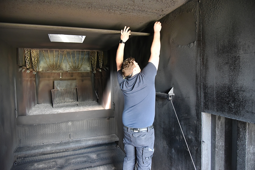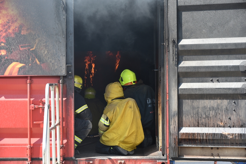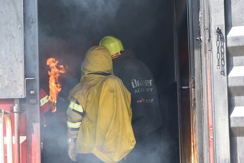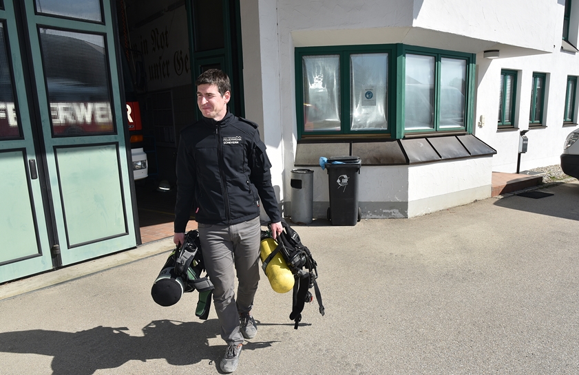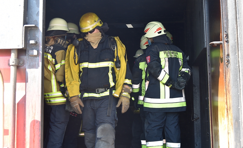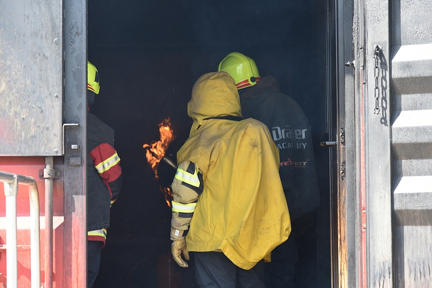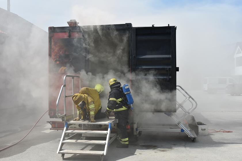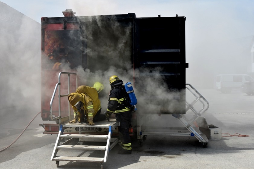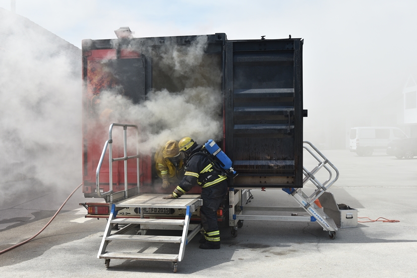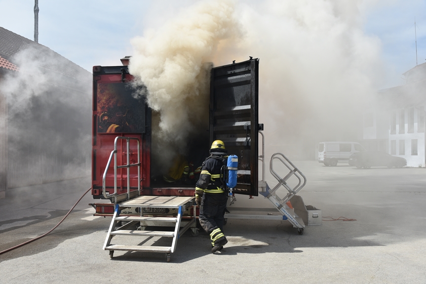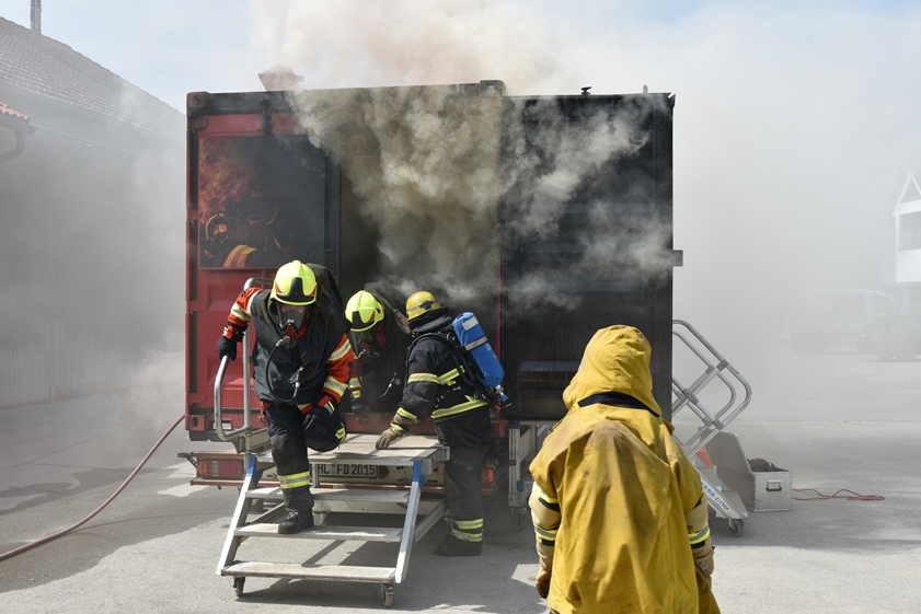 Am gestrigen Vormittag mussten hier zum Beispiel einige Feuerwehrleute aus Vohburg, Schweitenkirchen, Rockolding und Scheyern bis zu 500 Grad Hitze aushalten – und sie erlebten dabei, wie es sich anfühlt, wenn es im echten Unglücksfall etwa zu einem ausgedehnten Kellerbrand kommt. Tatsächlich standen in der speziell präparierten Kammer aber lediglich sieben großformatige Verlege-Platten in Flammen. Die Aufgabe für die so genannten Atemschutz-Geräte-Träger lautete, diese Bedingungen zunächst überhaupt auszuhalten, um schließlich diesen künstlich erzeugten Brand löschen zu können.