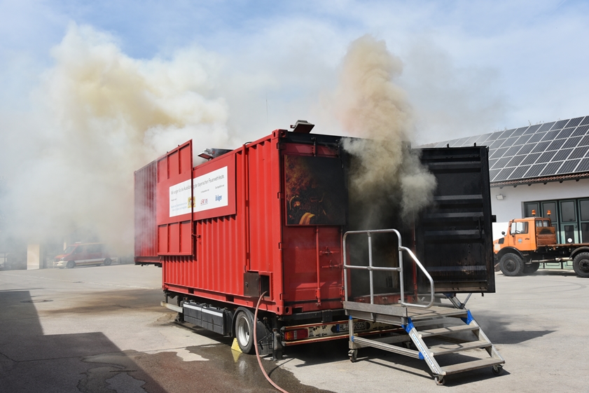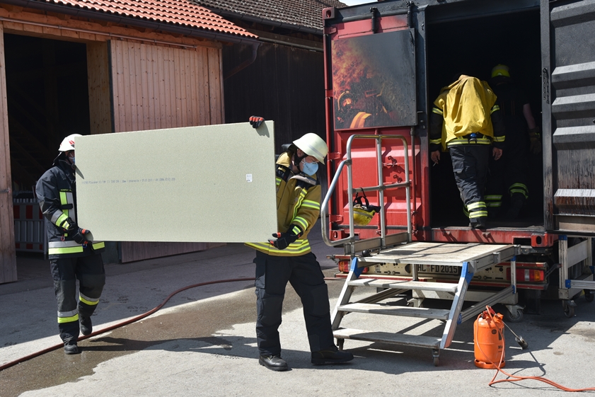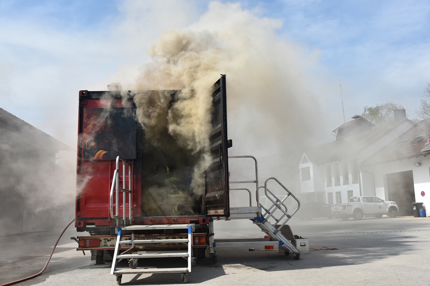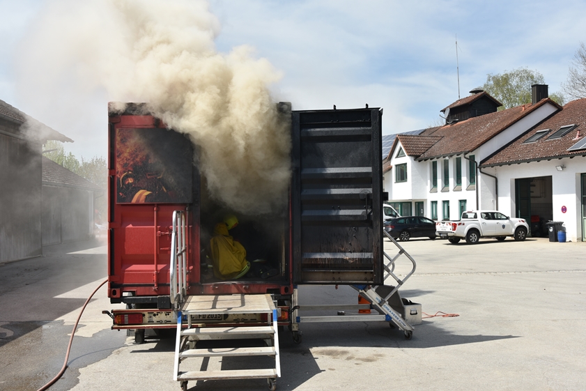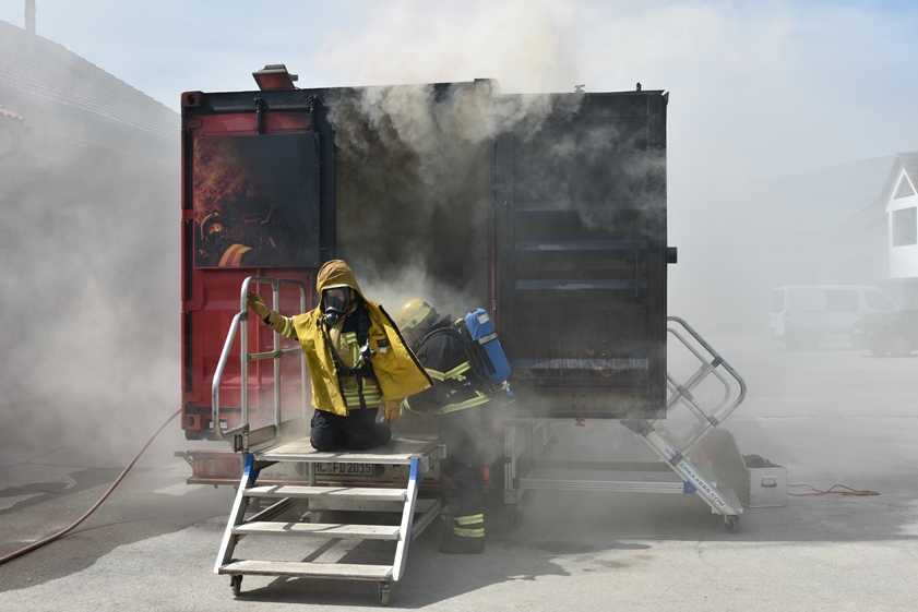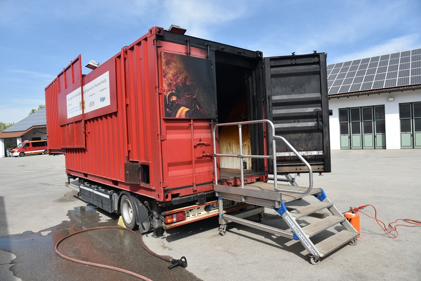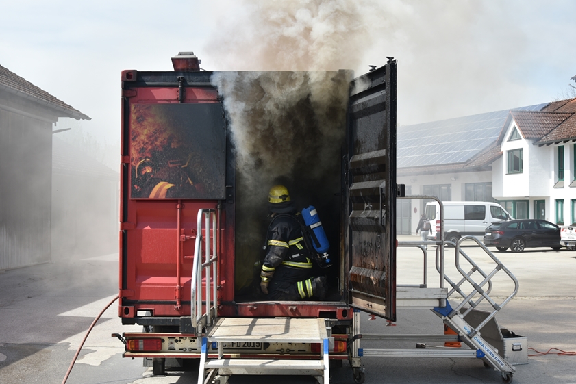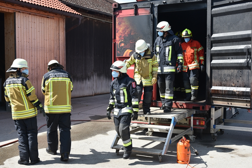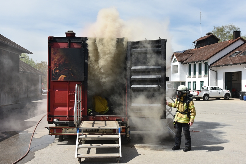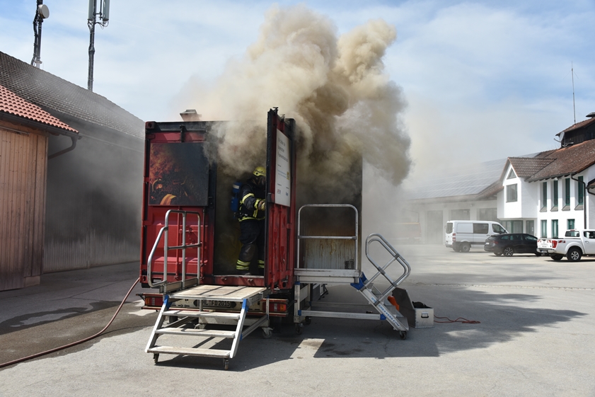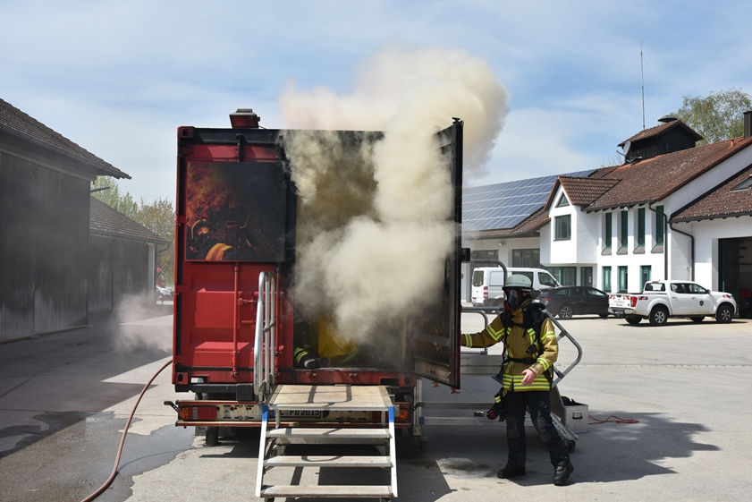 (ty) Beißender Rauch, Flammen und gewaltige Hitze schlagen den Feuerwehrleuten in dem geschlossenen Container entgegen. Und obwohl mitunter eine beachtliche Rauchsäule über dem Ort aufsteigt, so ist es zum Glück kein echter Einsatz. Vielmehr findet hier eine Sonder-Ausbildung statt, die nur eher selten absolviert werden kann. Es geht um die Sensibilisierung für Brände und Brand-Verläufe sowie um ganz spezielle Trainings-Möglichkeiten für Atemschutz-Geräte-Träger – allerdings unter sehr realistischen Bedingungen. Diese Woche war ein so genannter Brand-Übungs-Container bei der Feuerwehr in Scheyern stationiert.