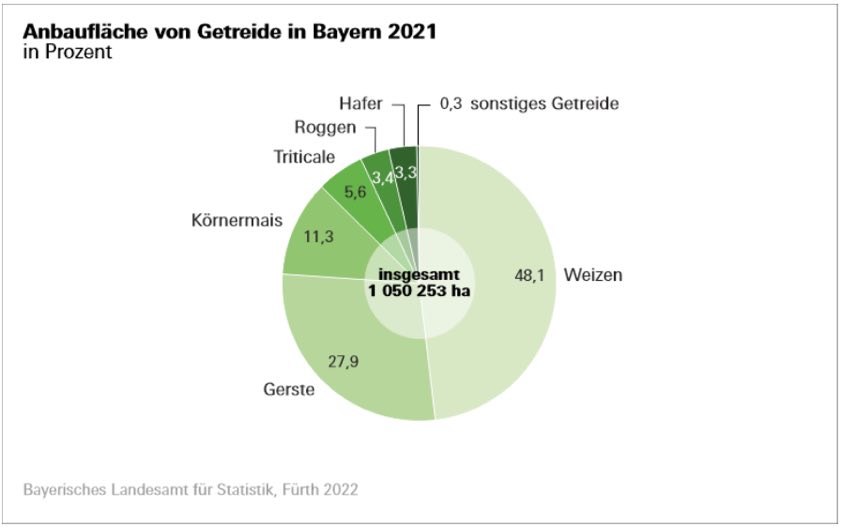Bayerns Landwirte bewirtschaften mit 51,9 Prozent weiterhin über die Hälfte des Ackerlands mit Getreide zur Körnergewinnung – einschließlich Körnermais und Corn-Cob-Mix (CCM). Die hierfür genutzte Fläche sank im Vergleich zum Vorjahr um 8100 Hektar auf 1 050 300 Hektar.