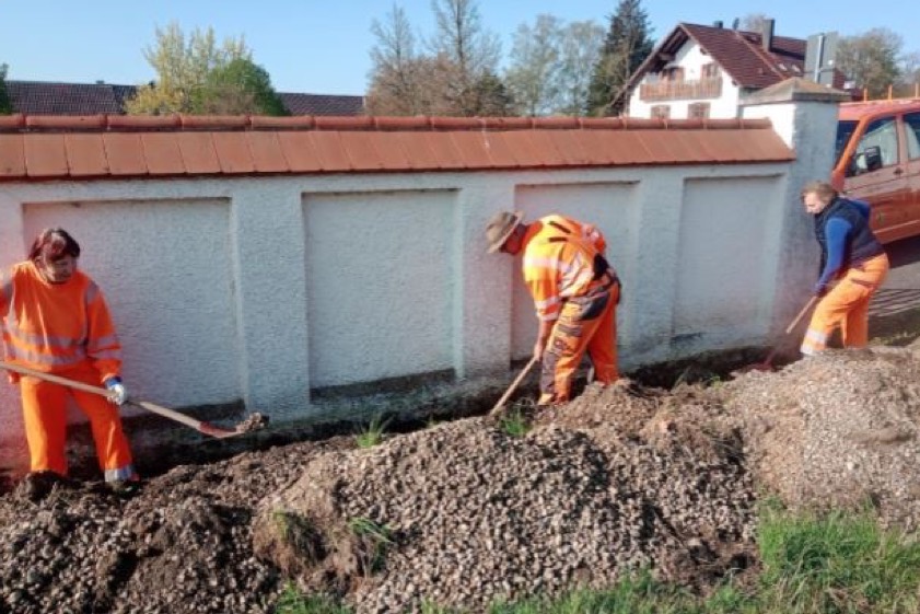 (ty) Am und im Friedhof von Hohenwart ist in den vergangenen Wochen fleißig gewerkelt worden. Wie die Gemeinde-Verwaltung mitteilte, wurde im Zuge von Sanierungs-Maßnahmen mit den Erdarbeiten zur Trockenlegung der denkmalgeschützten Mauer begonnen. Weil das Bauwerk nicht beschädigt werden sollte, kam nicht nur der Bagger zum Einsatz, sondern die Bauhof-Mitarbeiter hatten auch viel Handarbeit zu verrichten. "Nach Beendigung dieser notwendigen Vorarbeiten kann nun eine Maler-Firma mit den notwendigen Sanierungs-Arbeiten beginnen", heißt es aus dem Rathaus.