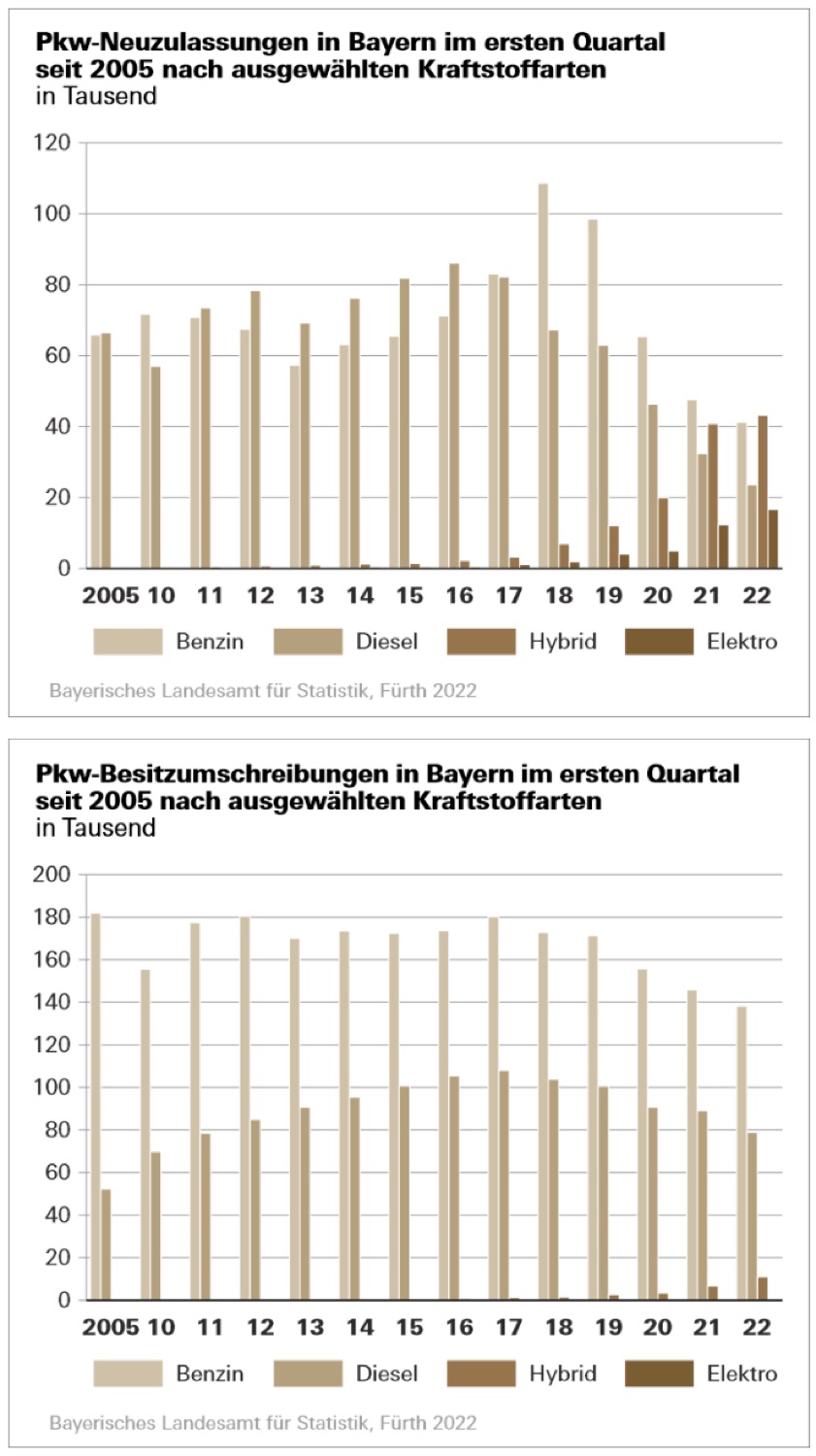 (ty) Die Zahl der neu zugelassenen Kraftfahrzeuge (Kfz) hat nach der aktuellen Auswertung der Statistik des Kraftfahrt-Bundesamtes im ersten Quartal dieses Jahres im Freistaat bei 155 219 gelegen. Das sind 5,9 Prozent weniger als im ersten Quartal des vergangenen Jahres. Wie das bayerische Landesamt für Statistik jetzt weiter mitteilte, sanken die Zulassungs-Zahlen von Personenkraftwagen (Pkw) um 6,0 Prozent auf 125 468. Die Neuanmeldungen von Benzinern verringerten sich um 13,4 Prozent auf 41 229, Diesel-Pkw nahmen ebenfalls zweistellig um 27,0 Prozent auf 23 652 Pkw ab. Dagegen stieg die Zahl von Pkw mit alternativen Antriebsarten (Gas, Elektro, Hybrid) weiter (plus 13,2 Prozent) und stellte damit im ersten Quartal 2022 das Gros der Neuzulassungen mit 60 587 Pkw. Die Zahl Besitz-Umschreibungen in diesem Segment erhöhten sich noch deutlicher um 62,6 Prozent auf nunmehr 15 540 Pkw.