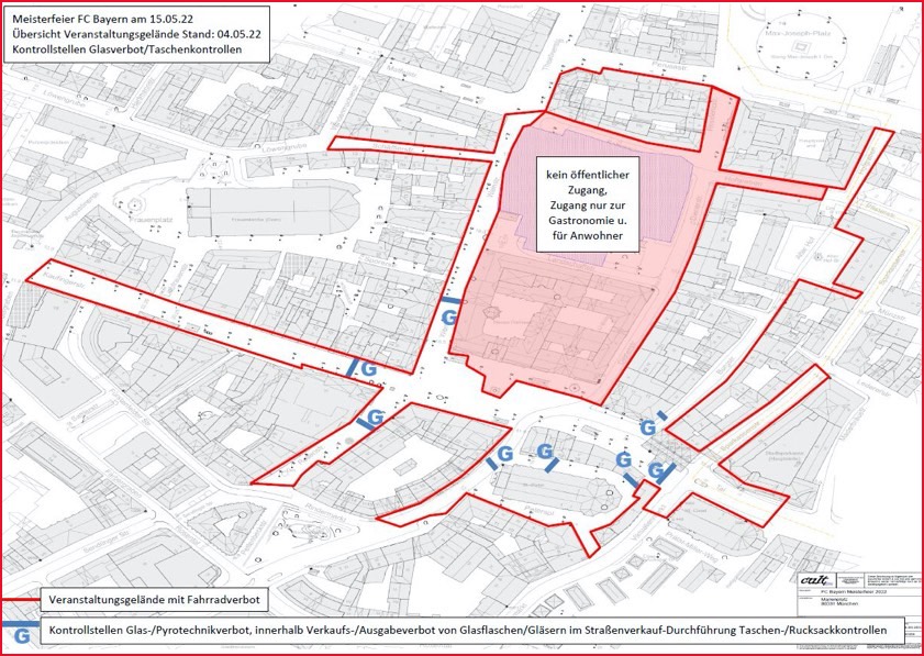 Der Zugang zur Gastronomie bleibe dabei grundsätzlich möglich. Im Laufe der Veranstaltung werde es aber, vor allem im Bereich des Marienplatzes, zu Beeinträchtigungen kommen. Das Inkraft-Treten der Sperrungen werde kurzfristig wieder über Twitter (#TitelfeierFCB; www.twitter.com/StadtMuenchen) bekannt gegeben. Sobald der Marienplatz voll sei, halten U-Bahnen nicht mehr am Marienplatz.Aufgrund einer Stammstreckensperrung verkehren keine S-Bahnen. Die nächste Haltestelle des Schienen-Ersatz-Verkehrs ist am Odeonsplatz. Der Stadtbus 132 fahre nur verkürzt. Die Haltestellen Tal, Viktualienmarkt, Marienplatz und Schrannenhalle entfallen. Die Linie beginne und endet somit in der Innenstadt am Isartor.