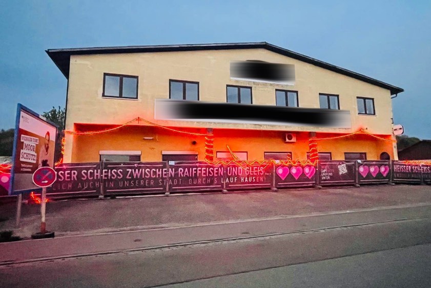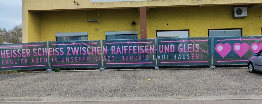 (zel/ty) Seit einigen Wochen darf über die Zukunft dieses Gebäudes an der Raiffeisenstraße in Pfaffenhofen wild spekuliert werden. Dafür sorgte vor allem ein Bauzaun, an dem ein stattliches Banner angebracht worden war mit der rosa-farbigen und vieldeutigen Aufschrift: "Heißer Scheiß zwischen Raiffeisen und Gleis... Endlich auch in unserer Stadt durchs LAUF HAUSEN!" Ist hier ein Etablissement geplant? Rotlicht-Milieu hinter gelben Mauern? Ein horizontales Gewerbe im Gewerbe-Gebiet? Tummeln sich hier künftig leichte Mädchen und schwere Freier? Oder ist das Ganze ein ausgebuffter – oder vielmehr: ausgepuffter – Marketing-Schachzug. Der Gebäude-Inhaber bringt nun zwar kein Rotlicht ins Dunkel, sorgt aber für Befriedigung durch Aufklärung.