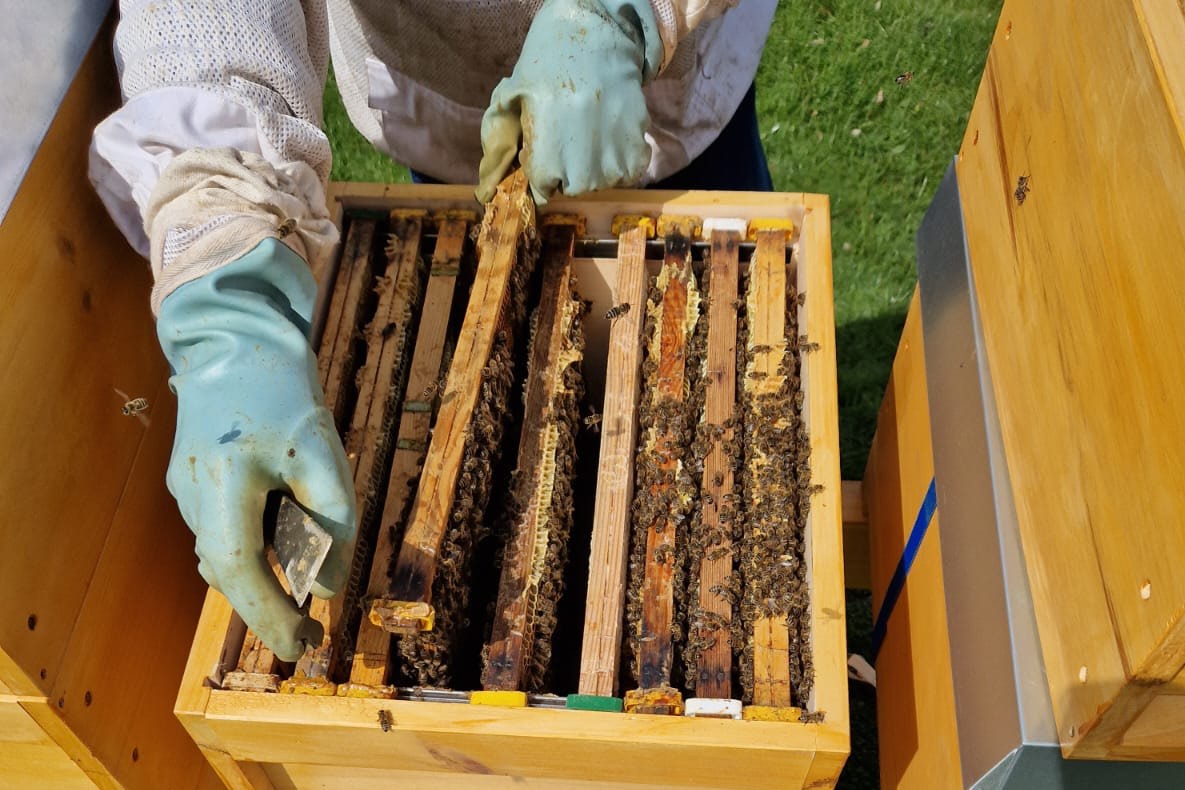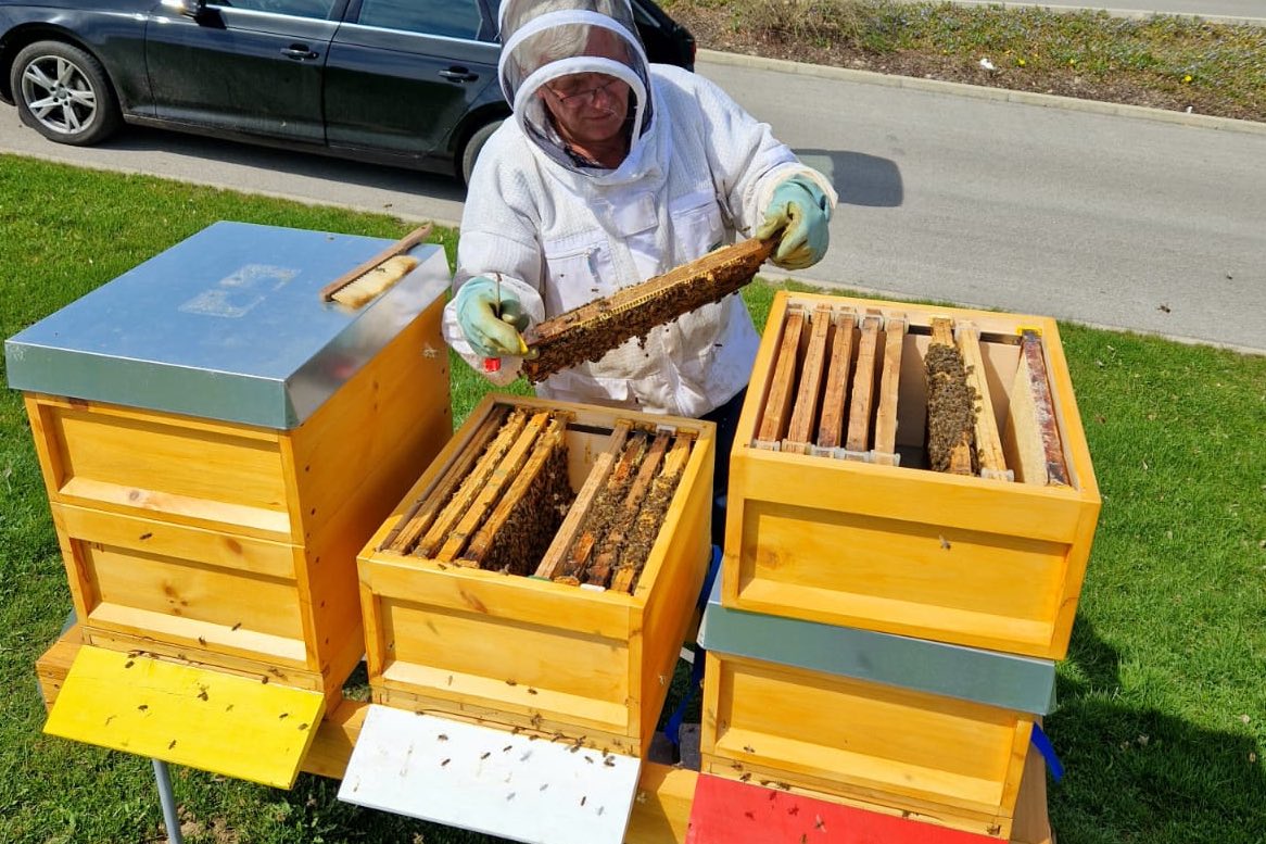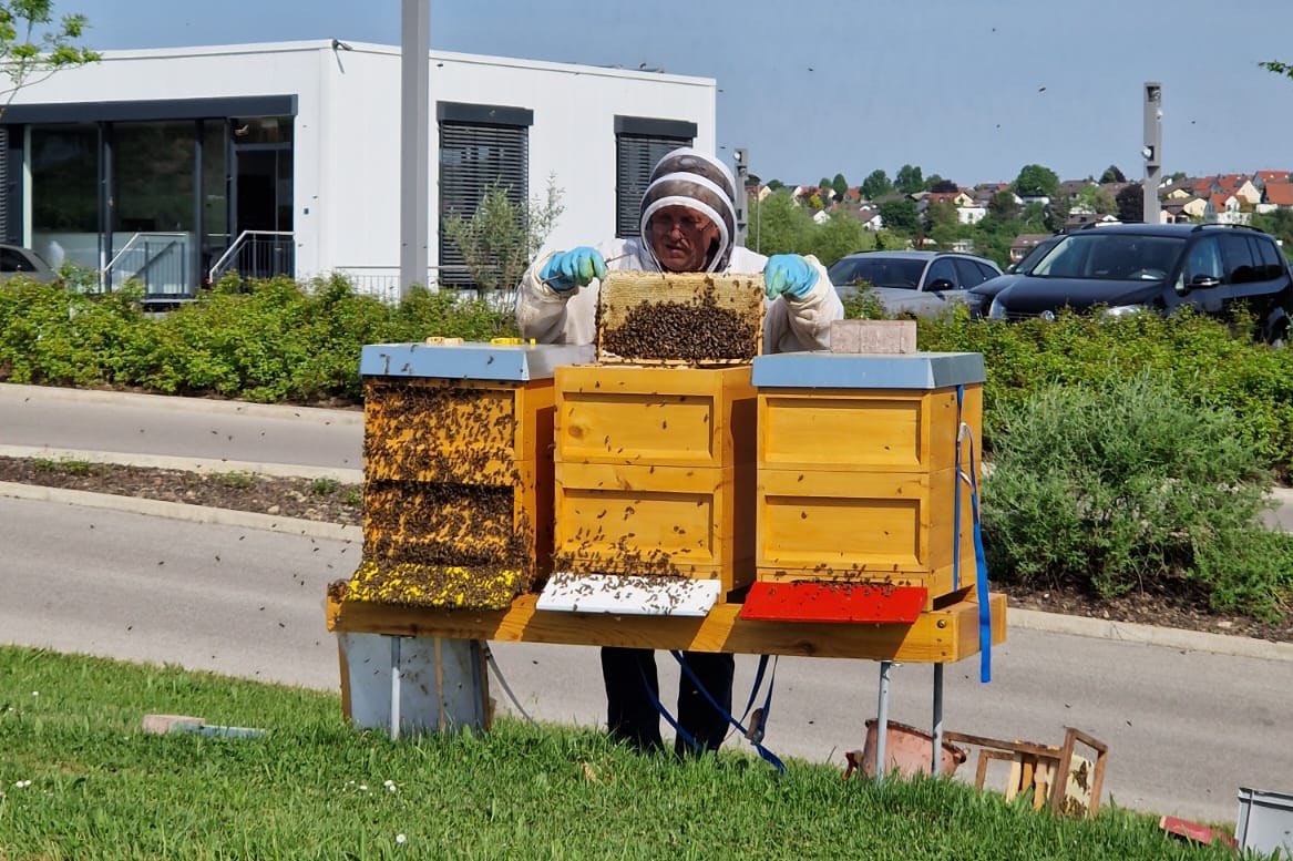 Die Tiere in ihren drei Stöcken produzieren nicht nur Honig, sondern sind ein weiterer bedeutender Baustein im Nachhaltigkeits-Konzept des Autohauses, das beispielsweise auch auf moderne Wasser-Aufbereitungs-Anlagen für die Auto-Wasch-Anlagen setzt.