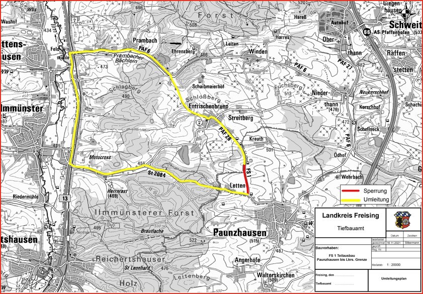 (ty) Der Kreis Freising saniert die Fahrbahn der Kreisstraße FS1 bei Paunzhausen. Die Maßnahme umfasst nach Angaben des Landratsamts den kompletten Deckenbau sowie die Tragschicht vom Kreuzungs-Bereich der FS1 mit der Staatsstraße 2084 bis zur Grenze zum Landkreis Pfaffenhofen in Richtung Entrischenbrunn. Die Bauarbeiten finden laut Behörde von 7. Juni bis voraussichtlich 1. Juli statt. In diesem Zeitraum sei die Kreisstraße für den gesamten Verkehr komplett gesperrt.