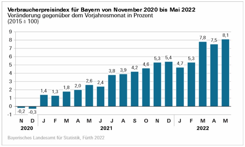 Die Inflationsrate, gemessen als prozentuale Veränderung des Verbraucherpreis-Index für Bayern gegenüber dem entsprechenden Vorjahres-Monat, liegt im Mai dieses Jahres bei deutlichen 8,1 Prozent. "Die Inflationsrate in Bayern lag zuletzt während der ersten Ölpreiskrise im Dezember 1973 über acht Prozent", so das Landesamt.