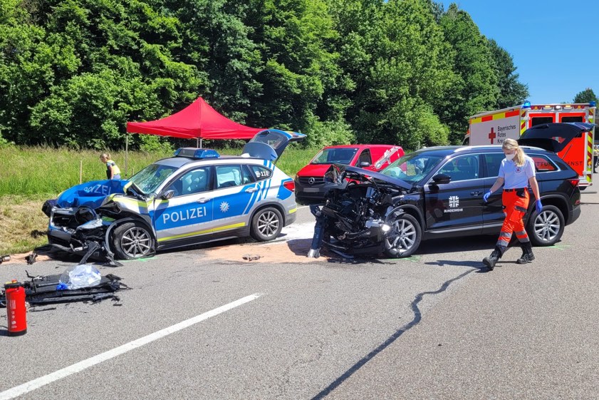 Bundeswehr-Pkw geriet auf die Gegenspur und kollidierte mit entgegenkommendem Streifenwagen der Polizeiinspektion aus Geisenfeld.
