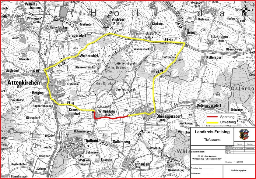 (ty) Der Kreis Freising saniert die Asphalt-Deckschicht der Kreisstraße FS 16 vom westlichen Ortseingang von Wimpasing inklusive Ortsdurchfahrt bis zum Ortseingang von Oberappersdorf. Die Arbeiten dauern nach Angaben des Landratsamts von 7. Juni bis voraussichtlich 1. Juli. Die Maßnahme umfasse die Sanierung der Kreisstraße mit einer neuen Asphalt-Deckschicht sowie der Erneuerung der Markierung. Neue Bushaltestellen sowie der Anschluss der Feldfahrt seien mitgeplant. Während der Arbeiten sei die Kreisstraße komplett gesperrt; der Verkehr werde großräumig umgeleitet (siehe Karte unten). Anlieger könnten die Straße mit Einschränkungen nutzen, um zu ihren Anwesen zu gelangen.