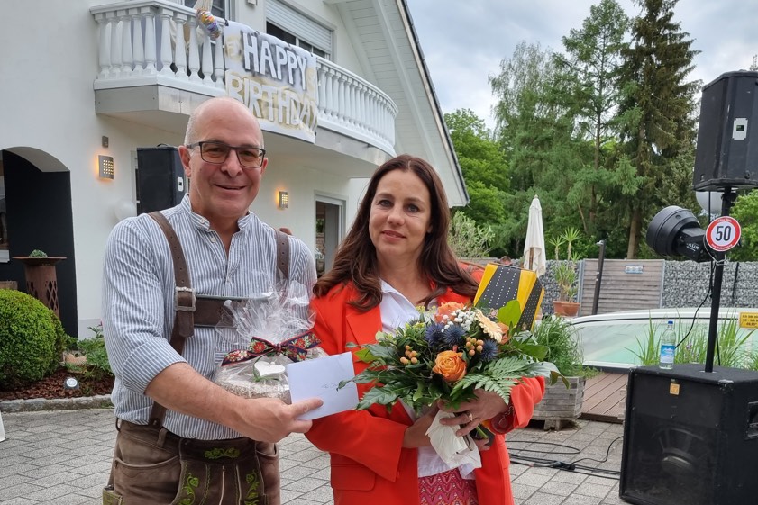 (ty) Die Schriftführerin des Gewerbe-Vereins von Scheyern, Daniela Stocker, hat kürzlich ihren 50. Geburtstag gefeiert. Im Namen des Vereins gratulierte ihr der Vize-Vorsitzende Wolfgang Inderwies (Foto oben). Er überreichte ihr Präsente und dankte ihr für ihr langjähriges Engagement. Daniela Stocker ist in der Region als frühere Gastronomin bestens bekannt.