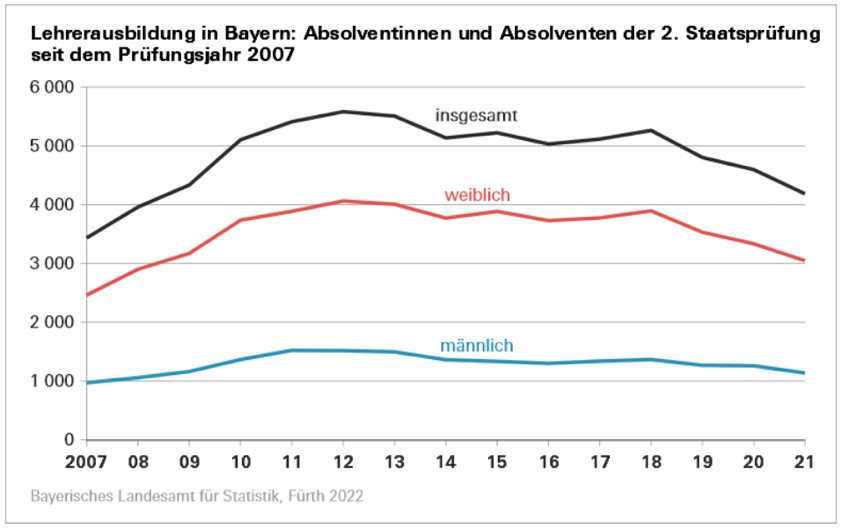 Auf den Vorbereitungsdienst folgt die "Zweite Staatsprüfung", die im vergangenen Jahr – zu den Prüfungs-Terminen Februar beziehungsweise September – von 4188 neuen Lehrkräften abgeschlossen wurde. Gegenüber den 4599 "Zweiten Staatsprüfungen" des Jahres 2020 ist das ein Rückgang um 8,9 Prozent.