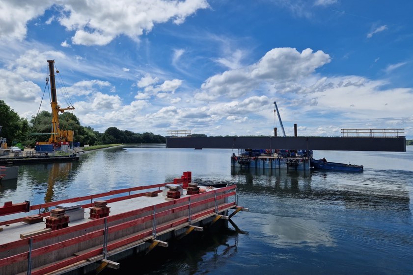 Für den Neubau der Donau-Brücke bei Bertoldsheim werden derzeit rund 62 Tonnen schwere und 38 Meter lange Träger gesetzt. Alte Brücke ab Montag gesperrt.