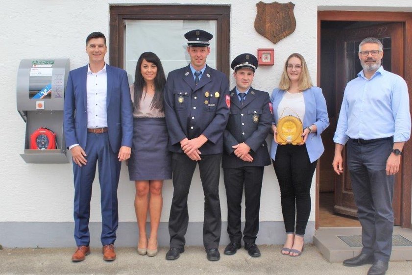 (ty) Im Gemeinde-Bereich von Hohenwart gibt es einen weiteren Defibrillator – und zwar in Weichenried. Die Volksbank-Raiffeisenbank Bayern-Mitte zeigte sich spendabel und kaufte das Gerät, das auch schon offiziell übergeben wurde (Foto oben). Angebracht wurde der Defibrillator mittlerweile am örtlichen Feuerwehrhaus, wo er nun rund um die Uhr zur Verfügung steht und für jedermann greifbar ist. Zu Übungs-Zwecken stellte außerdem die Gemeinde-Verwaltung ein entsprechendes Gerät zur Verfügung. Um den Einwohnern von Weichenried sowie den benachbarten Ortsteilen die Funktionsweise des Defi zu erklären sowie um Fragen in diesem Zusammenhang zu beantworten, will die Feuerwehr von Weichenried demnächst eine Info-Veranstaltung für alle Interessierten abhalten.