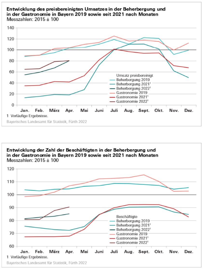 Die Beschäftigtenzahl in der Gastronomie erhöhte sich im April dieses Jahres um gut ein Drittel zum Vorjahres-Monat, lag jedoch noch 15,3 Prozent unter dem April vor der Pandemie. In der Beherbergung waren im April heuer 17,6 Prozent mehr Personen beschäftigt als im April vergangenen Jahres, aber 18,5 Prozent weniger als im April 2019. Im Vergleich zum März dieses Jahres stieg der nominale Umsatz des bayerischen Gastgewerbes im April um knapp zehn Prozent; die Zahl der Beschäftigten wuchs zum Vormonat um 2,9 Prozent.