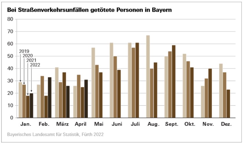 In den ersten vier Monaten des laufenden Jahres 2022 erhöhte sich die Anzahl der Unfälle um 10,5 Prozent auf 108 836. Mit 14 348 Verunglückten wurden insgesamt um 10,4 Prozent mehr Menschen im Straßenverkehr getötet oder verletzt als im stärker von der Corona-Pandemie geprägten Vorjahres-Zeitraum. Im Vergleich zum von der Pandemie unbeeinflussten Zeitraum Januar bis April 2019 gab es allerdings um 22,7 Prozent weniger Verunglückte (minus 13 Getötete, minus 4209 Verletzte).