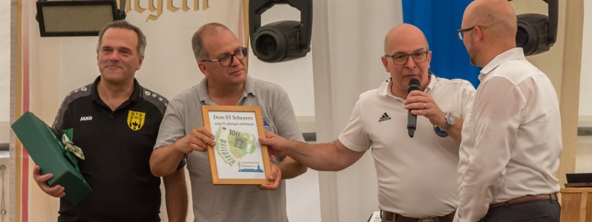 Im Rahmen des Fest-Akts zum 75-jährigen Bestehen des ST Scheyern sorgten die Vorsitzenden des Gewerbe-Vereins Scheyern, Mike Jäger und Wolfgang Inderwies, für eine Überraschung: Der Gewerbe-Verein spendierte dem STS für jedes Jahr seines Bestehens zehn Euro, in Summe also 750 Euro. STS-Chef Martin Koch nahm die in einen edlen Holzrahmen gekleidete Finanzspritze überrascht und überwältigt entgegen.