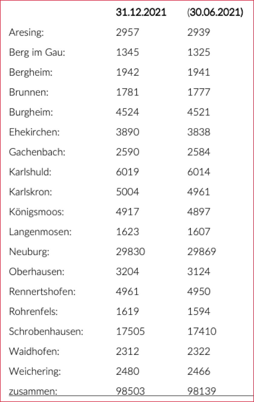(ty) Die Zahl der Einwohner im Kreis Neuburg-Schrobenhausen steigt weiter an. Wie das Landratsamt unter Berufung auf die jüngsten offiziellen Daten des bayerischen Landesamts für Statistik mitgeteilt hat, lebten zum 31. Dezember vergangenen Jahres ingesamt 98 503 Menschen in den 18 Landkreis-Gemeinden. Im Vergleich zur Erhebung vom 30 Juni vergangenen Jahres, als 98 139 gemeldet worden waren, bedeute das eine Zunahme von 0,37 Prozent oder 364 Einwohner. In 16 der 18 Gemeinden sei ein Einwohner-Zuwachs zu verzeichnen.