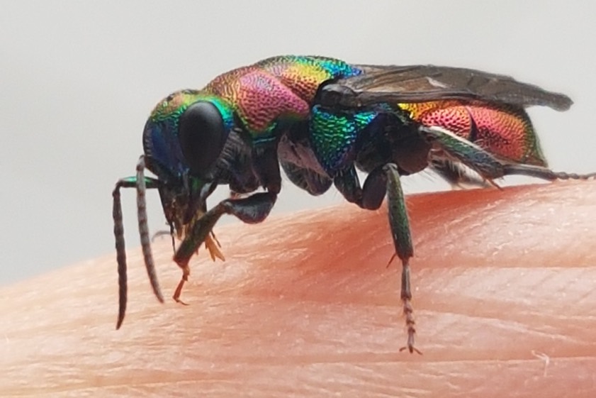 (ty) Und weiter geht sie, die Serie von beeindruckenden Fotos aus der Region, die uns unsere Leserinnen und Leser nach wie vor übermitteln. Das Bild, das wir Ihnen heute zeigen können, hat uns Sandra Zeitler aus dem Gemeinde-Bereich von Reichertshofen geschickt. Sie hatte im wahrsten Sinne des Wortes einen schillernden Gast in ihrer Küche im Ortsteil Winden am Aign. "Es müsste sich dabei um eine Bienenwolf-Goldwespe handeln", berichtet sie über die glamouröse Besucherin und hat auch eine mögliche Erklärung für deren Auftauchen: "Ich habe letztes Jahr ein Stein- und Sandbeet mit den entsprechenden Pflanzen angelegt – es scheint ihr zu gefallen!"