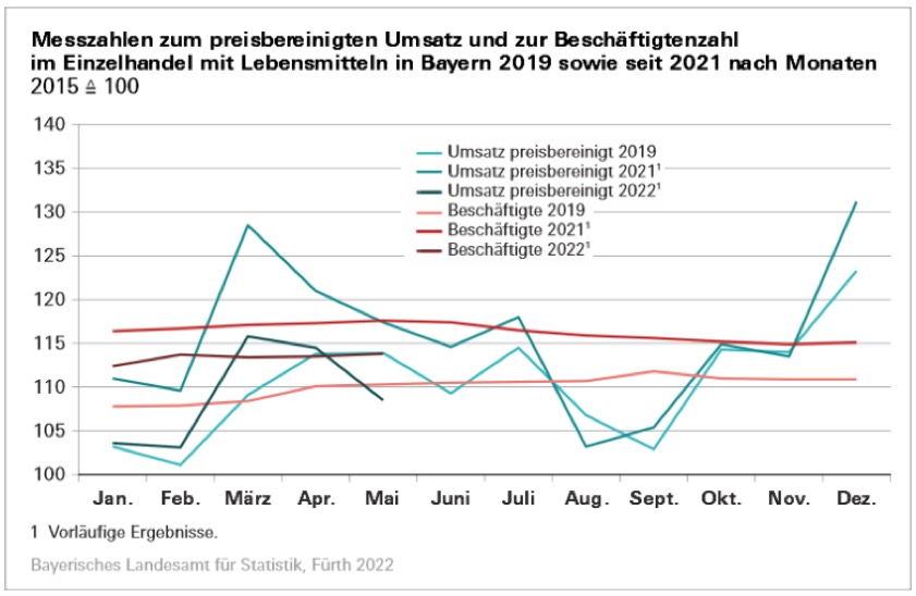 Der "Einzelhandel mit Motoren-Kraftstoffen (Tankstellen)" verzeichnete im Mai heuer ein nominales Umsatz-Wachstum von 17,0 Prozent zum Vorjahres-Monat. Preisbereinigt lag der Umsatz jedoch 11,0 Prozent unter dem Umsatz aus dem Mai 2021. Ein nominaler Umsatz-Zuwachs bei realer Umsatz-Minderung verglichen zum Vorjahres-Monat trat auch im bayerischen "Einzelhandel mit Waren verschiedener Art" und im "Einzelhandel mit Nahrungs- und Genussmitteln, Getränken und Tabakwaren" (jeweils in Verkaufsräumen) auf. Auch im "Lebensmittel-Einzelhandel" war diese Entwicklung ersichtlich sowie im bayerischen Einzelhandel insgesamt.