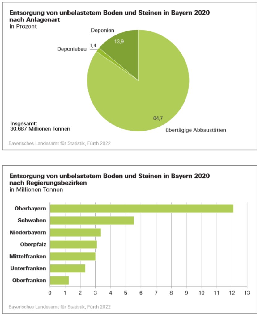 Innerhalb Bayerns gab es große Unterschiede hinsichtlich der Entsorgungs-Mengen. Auf Ebene der Regierungsbezirke wurde mit 12,1 Millionen Tonnen die größte Menge Boden und Steine in Oberbayern entsorgt. Im Landkreis Starnberg belief sich die entsorgte Menge auf 1,6 Millionen Tonnen – Spitzenreiter unter den Landkreisen. Weitere Landkreise in denen über eine Million Tonnen entsorgt wurden, waren der Landkreis Neumarkt/Oberpfalz (1,3 Millionen Tonnen) und der Landkreis Traunstein (1,2 Millionen Tonnen). Dagegen waren die Mengen in den kreisfreien Städten aufgrund fehlender Entsorgungs-Möglichkeiten eher gering.