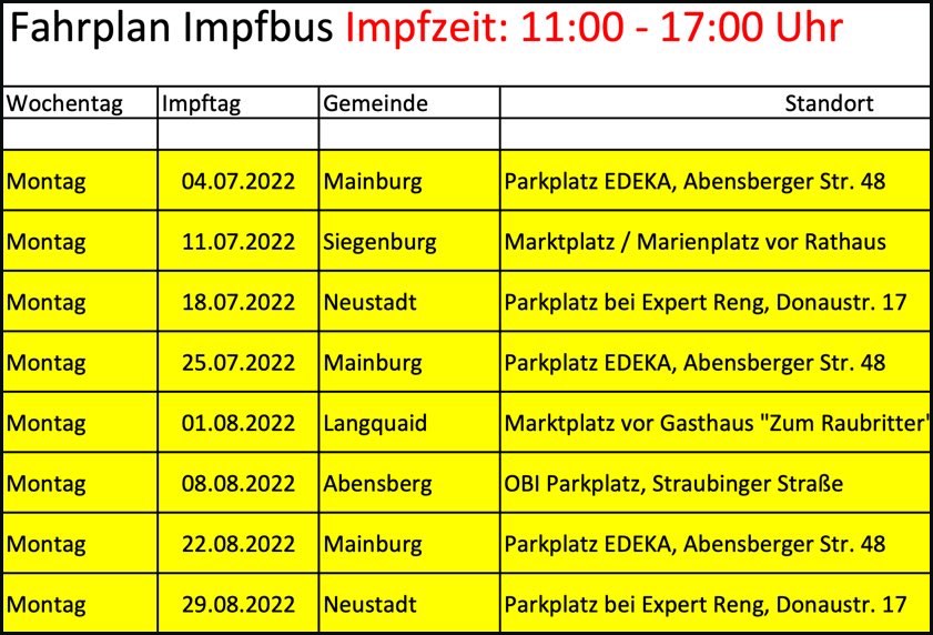 (ty) Auch im Juli und August ist der Corona-Impf-Bus jeweils montags im Kreis Kelheim unterwegs. Darauf hat das Landratsamt hingewiesen und den detaillierten Terminplan für die kommenden Wochen bekanntgegeben (siehe unten). Station machen wird das mobile Impf-Team demnach in Mainburg, Siegenburg, Neustadt an der Donau, Langquaid und Abensberg – in manchen Orten mehr als einmal. Das Angebot richtet sich an alle Interessierten im Alter ab zwölf Jahren und gilt unabhängig vom Wohnort. Nachfolgend die wichtigsten Infos im Überblick.