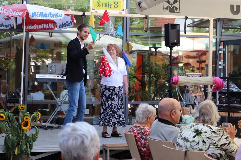 Ein Dankeschön richtete Heidi Andre an alle Ehrenamtlichen, Helfer und Mitwirkenden, die das Fest möglich gemacht haben. Sie trug außerdem ein Gedicht über den beeindruckenden Zusammenhalt im Bürger-Zentrum am Hofberg vor. Das Programm bot unter anderem einen Sketch der Theater-Gruppe vom Hofberg, der bei den Zuschauerinnen und Zuschauern für viel Unterhaltung und laute Lacher sorgte. Amüsant war auch der Einakter "Trambahn-Ritzen-Reinigungsdame", gespielt von Friedl Fuchshuber. Ein Highlight des Nachmittags war zudem die Zauber-Show von Phil Rice, Deutschlands jüngstem professionellem Magier. Er begeisterte die Gäste mit seiner Show und gab nach lauten Rufen aus dem Publikum noch die geforderte Zugabe.