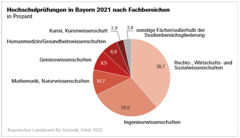 (ty) Im Prüfungsjahr 2021 (Winter-Semester 2020/21 und Sommer-Semester 2021) sind an den Universitäten und Fachhochschulen im Freistaat insgesamt 78 626 Abschluss-Prüfungen erfolgreich abgelegt worden. Wie das bayerische Landesamt für Statistik nach vorläufigen Angaben heute weiter mitteilte, stieg die Zahl der Studien-Abschlüsse damit gegenüber dem vorangegangenen Prüfungsjahr um 8,5 Prozent, sodass insgesamt wieder das Niveau des Vor-Corona-Jahres 2019 erreicht war. Im Jahr 2020 war ein Rückgang um 8,4 Prozent zu verbuchen.