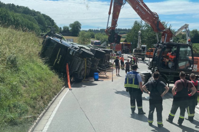 Zeugen des Unfalls werden darum gebeten, sich unter der Telefonnummer (0 87 61) 30 18 0 bei der Polizeiinspektion in Moosburg/Isar zu melden. Neben Streifenbeamten und dem Rettungsdienst waren insgesamt rund 50 Einsatzkräfte von den Feuerwehren aus Au/Hallertau, Enzelhausen, Osterwaal und Tegernbach sowie die Straßen-Meisterei und eine Spezial-Firma für Straßen-Reinigung vor Ort. Laut Feuerwehr wurde die Lkw-Ladung in Form von Gras-Silage weitestgehend umgeladen, um das Gewicht des Aufliegers zu verringern. Durch den Einsatz von drei Mobil-Baggern und einem Teleskop-Lader sei es dann gelungen, das Gespann wieder aufzustellen. Mit Hilfe einer Seilwinde sei das Gespann während der Bergung gesichert worden.