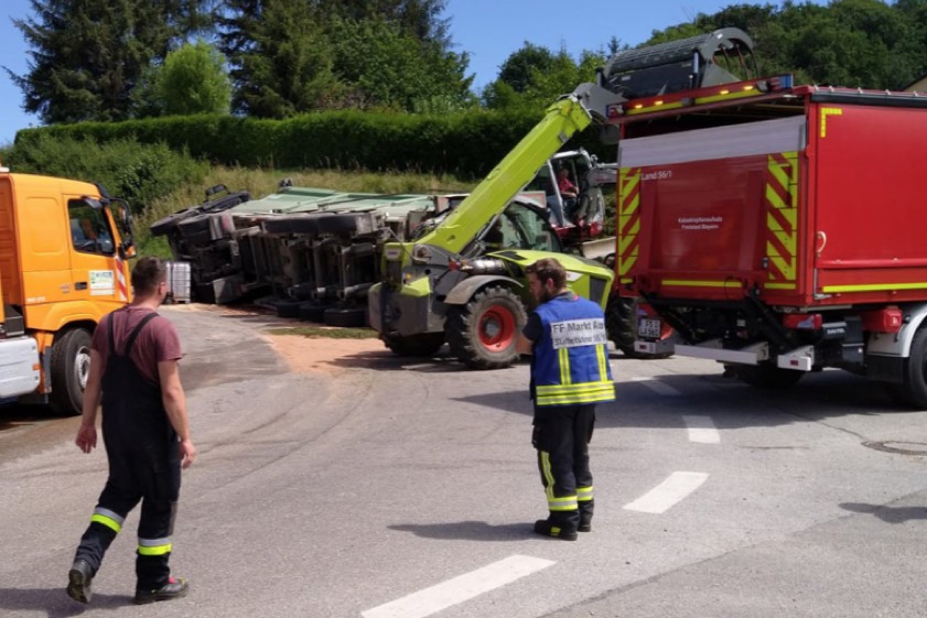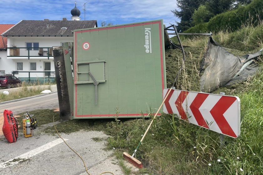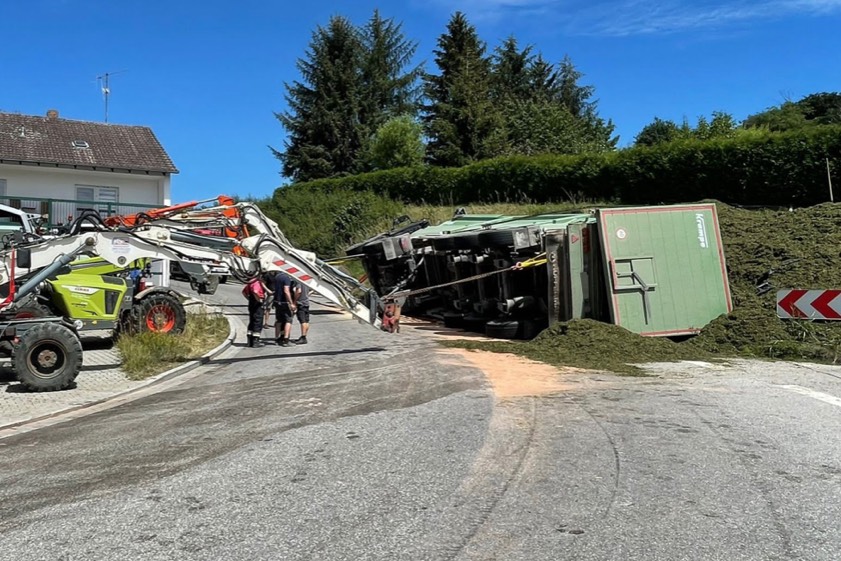 In einer Kurve in Enzelhausen kippte das mit Gras-Silage beladene Gespann nach rechts um. Aufwändige Bergungs-Maßnahmen.