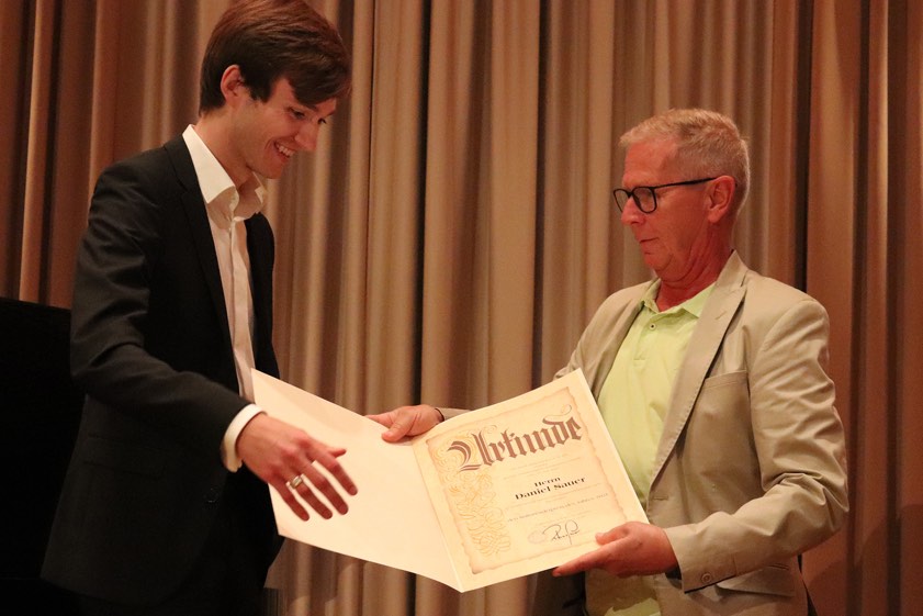 Kultur-Referent Haiplik würdigte Daniel Sauer und dessen bisherigen Werdegang ausführlich in seiner Laudatio: "In vier Wochen wird er erst 23 Jahre alt und hat doch schon eine musikalische Karriere hinter sich, die uns in Staunen versetzt. Sagte er bereits in frühen Kindertagen, ich mach' Bühne, so singt er heute als Bariton in renommierten Chören und auf großen Bühnen." Nicht nur Fleiß, Disziplin und Arbeitseifer zeichnen Daniel Sauer laut Haiplik aus, "sondern auch außerordentliche Begabung, überragendes Talent und eine Sensibilität, ohne die wahres Künstlertum nicht auskommt".