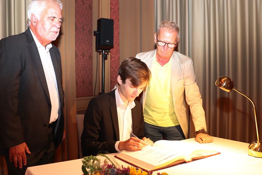 Daniel Sauer trägt sich unter den Augen von Reinhard Haiplik und Roland Dörfler in das Goldene Buch der Stadt ein.