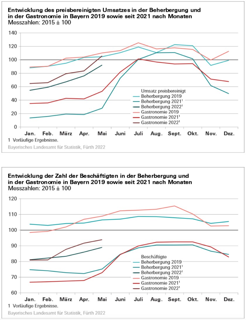 Im Vergleich zum April dieses Jahres stieg der nominale Umsatz im Gastgewerbe in Bayern im Mai um 26,5 Prozent und die Zahl der Beschäftigten um 2,8 Prozent. In den ersten fünf Monaten dieses Jahres erhöhte sich der nominale Umsatz des Gastgewerbes in Bayern gegenüber dem entsprechenden Vorjahres-Zeitraum um 145,9 Prozent und der reale Umsatz um 134,4 Prozent. Die Zahl der Beschäftigten nahm um 22,5 Prozent zu.