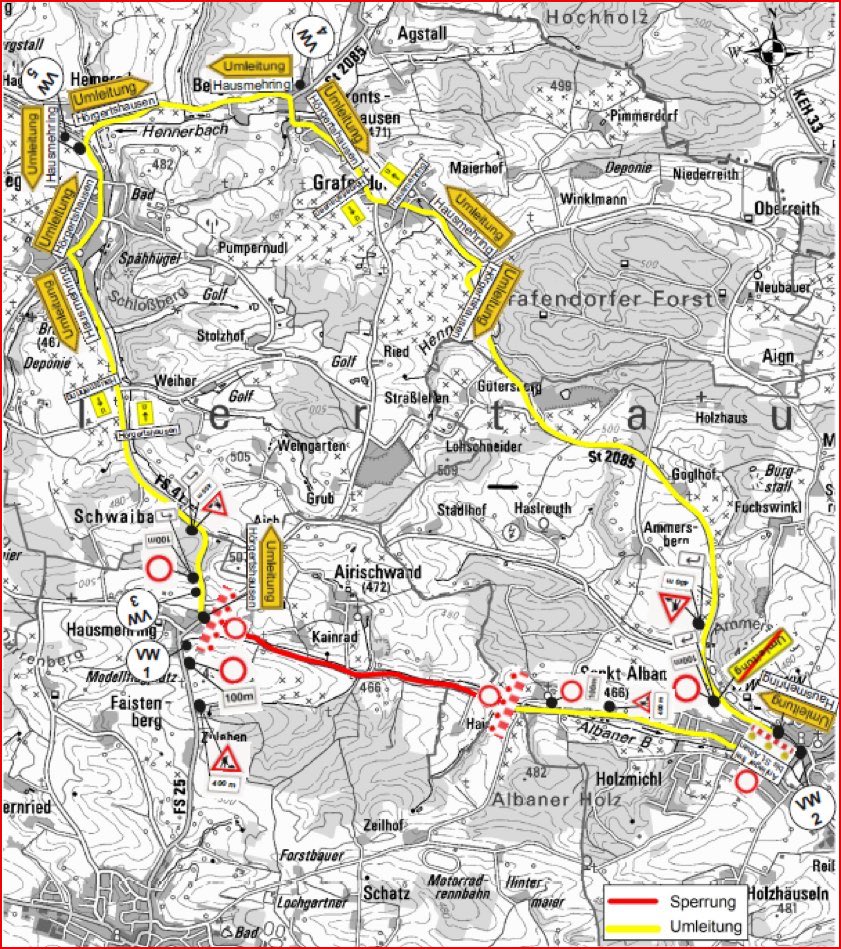 Anlieger könnten die Straße mit Einschränkungen nutzen, um zu ihren Anwesen zu gelangen. Der Verkehr wird laut Mitteilung des Landratsamts ab der Abzweigung in Hausmehring über die Kreisstraße FS41, Tegernbach, Kreisstraße FS38, Kreisstraße FS37, Hebrontshausen, Staatsstraße 2085 und Hörgertshausen wieder auf die FS25 nach Sankt Alban geführt. Die Umleitung für die Gegenrichtung erfolge analog. Die Umleitungs-Strecke sei ausgeschildert. Der Umleitungs-Fahrplan für den MVV werde ausgehängt und sei außerdem auf www.mvv-muenchen.de abrufbar.