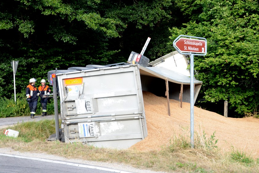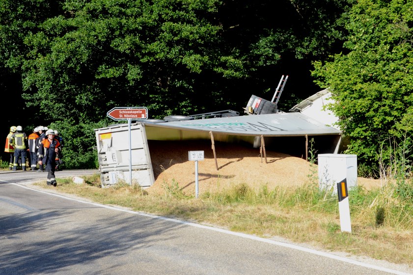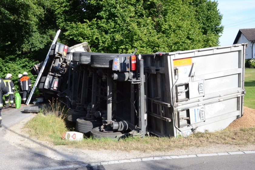 In Schenkenau kippte ein mit 25 Tonnen Dinkel beladener Lkw neben der ND17 um. 600 Liter Diesel liefen ins Erdreich und in ein Gewässer.