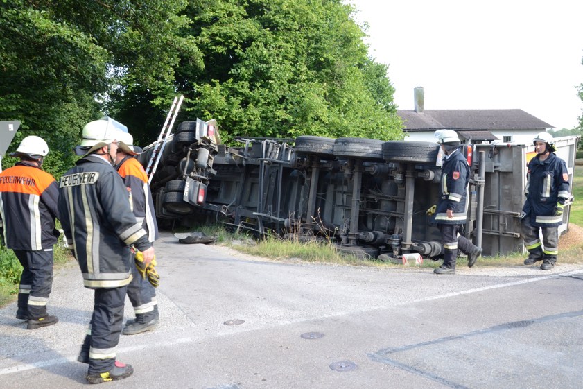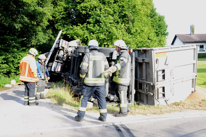Das Unglück geschah gegen 17.45 Uhr. Ein 75 Jahre alter Lkw-Fahrer war nach Angaben der zuständigen Polizeiinspektion aus Schrobenhausen mit seinem Gespann auf der Kreisstraße ND17 unterwegs und wollte von dieser in den Schloßweg einbiegen. Dabei sei der Sattelzug leicht ins Bankett geraten und das Bankett habe unter dem Gewicht nachgegeben. Dadurch sei der Sattel-Auflieger nach rechts gekippt und habe auch die Zugmaschine mit sich gerissen. Der Brummi-Lenker sei unverletzt geblieben, hieß es am Abend.