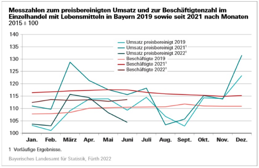 Die Zahl der Beschäftigten im bayerischen Einzelhandel insgesamt ging zum Vorjahres-Monat um 0,2 Prozent zurück. Am stärksten nahm dabei die Beschäftigtenzahl im "Einzelhandel an Verkaufsständen und auf Märkten" ab (minus 4,6 Prozent). Im Juni sank der nominale Umsatz der Einzelhändler Bayerns gegenüber Mai 2022 um nominal 3,7 Prozent. Die Zahl der Beschäftigten war zum Vormonat nur geringfügig um 0,1 Prozent rückläufig.