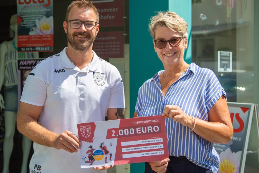 (ty) Erfolgreiche Jugend-Begegnungen und eine gelungene Spenden-Aktion für den guten Zweck: Die Organisatoren des TSV Paunzhausen blicken stolz auf ein Fußball-Wochenende der besonderen Art zurück. Rund 200 Kinder aus 19 Nachwuchs-Teams waren im Juli zu Gast auf der Sport-Anlage des Vereins. Neben den Fußball-Turnieren für die F-, E- und D-Junioren gab es ein kurzweiliges Rahmenprogramm. Letzteres umfasste eine große Hüpfburg und verschiedene Geschicklichkeits-Stationen wie Soccer-Darts und Torwand-Schießen. Außerdem konnte man seine eigene Schusskraft testen und die Geschwindigkeit messen. Heute wurden nun 2000 Euro an die von der Pfaffenhofener Kleider-Kammer initiierte Ukraine-Hilfe übergeben.