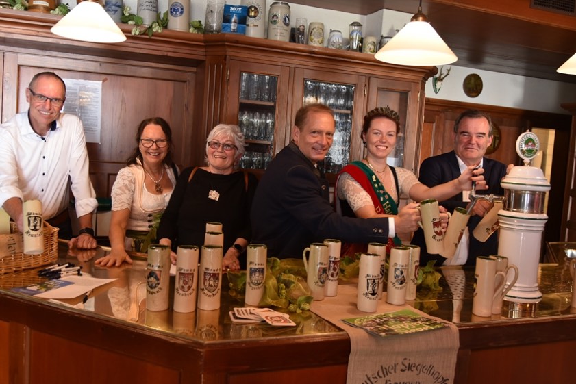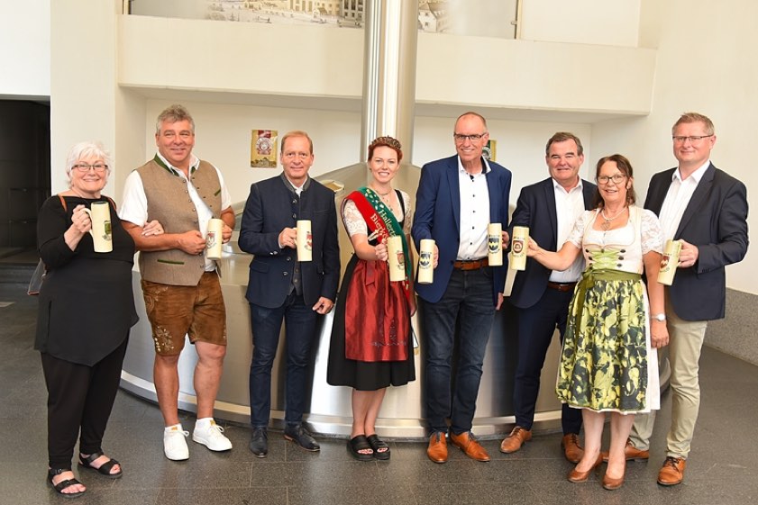 Mit dabei bei dem Termin waren auch der Pfaffenhofener Landrat Albert Gürtner (FW), der die Schirmherrschaft für das Hopfensiegelfest übernommen hat, sowie Aileen Berger, die amtierende Hallertauer Bierkönigin, und der Geisenfelder Vize-Bürgermeister Erich Erl (FW). Außerdem: Stadtrat und Kulturausschuss-Mitglied Manfred Niebauer (USB), Hofbrauhaus-Geschäftsführer Jürgen Charrois und Siegelfest-Initiatorin Hildegard Heindl. "Mit dem GGA-Siegel wird dokumentiert, dass der zum Brauen des Bieres verwendete Hopfen-Anteil zu mindestens der Hälfte aus einem Hallertauer Anbau-Gebiet stammt", fasst die Stadt Geisenfeld in einer Presse-Mitteilung zusammen.