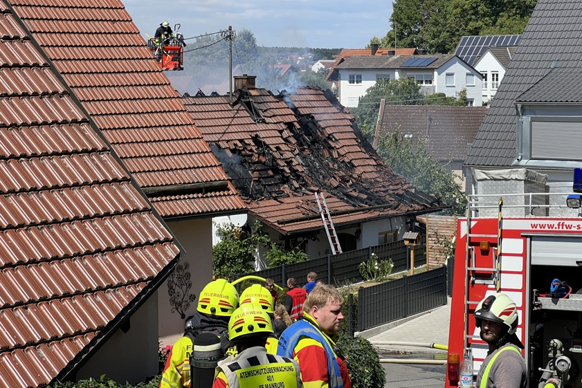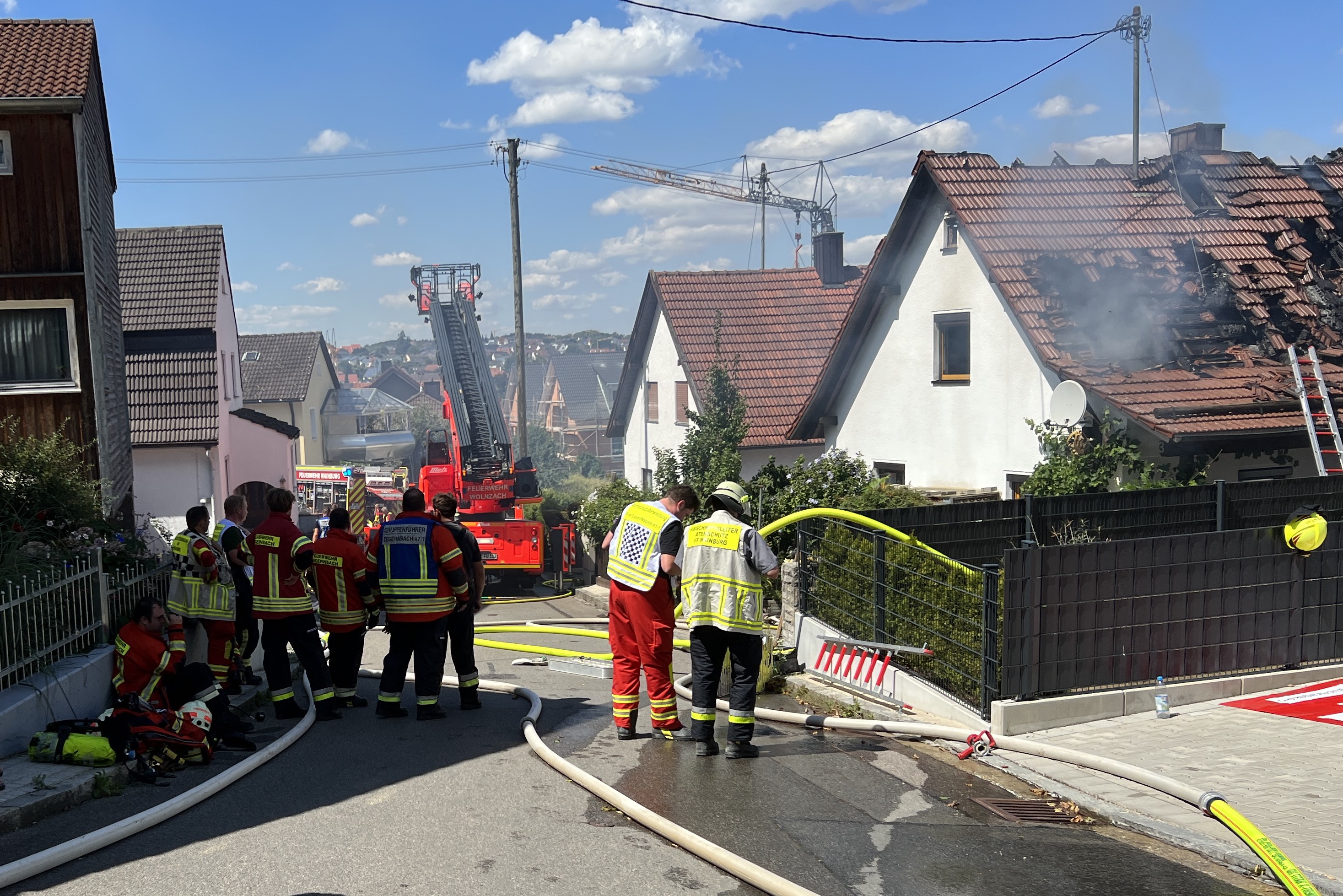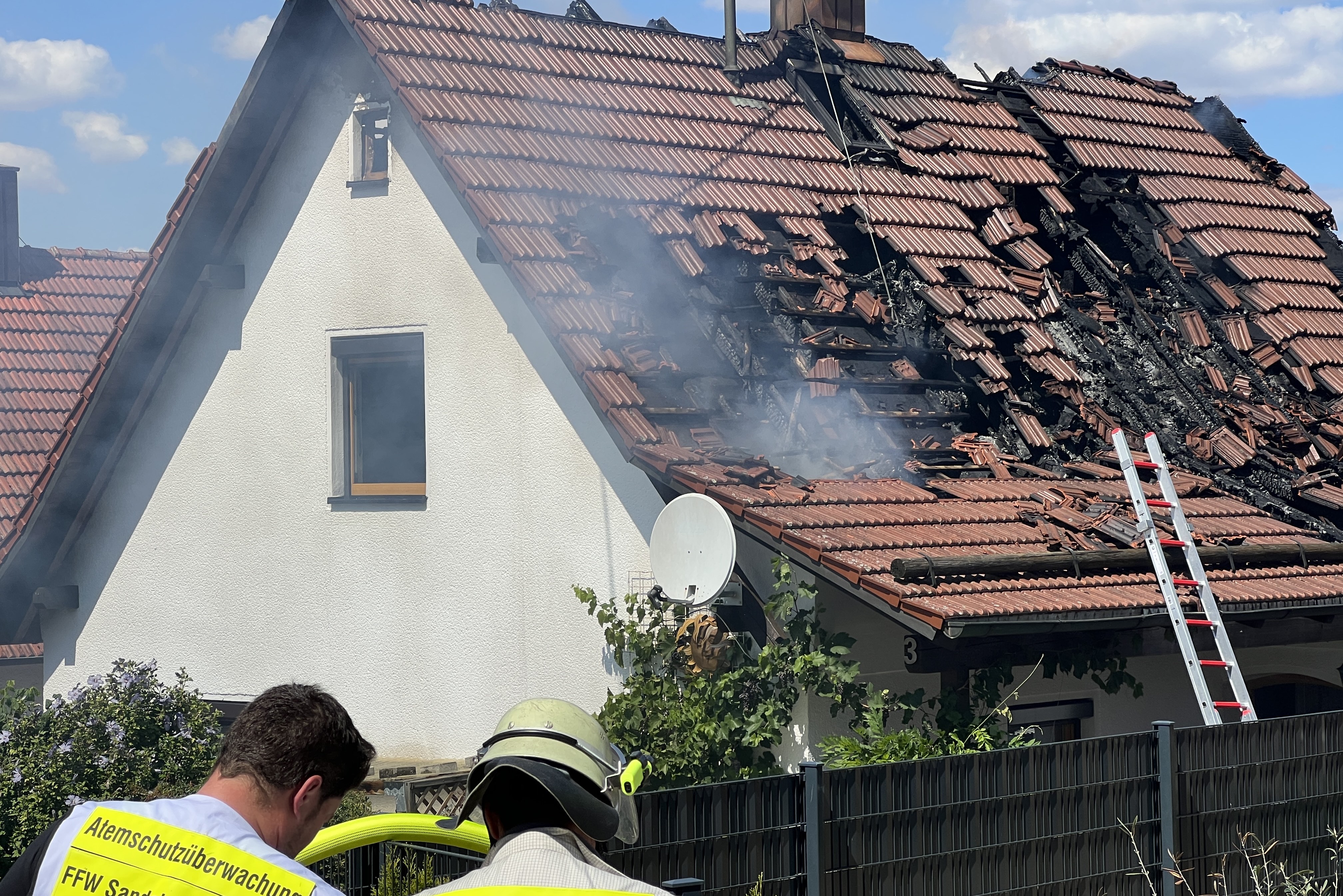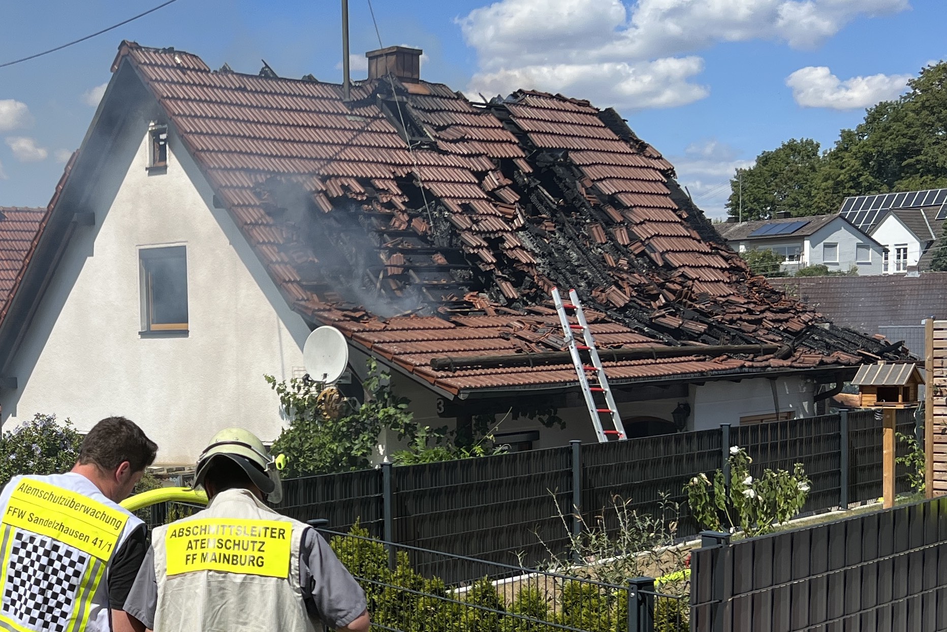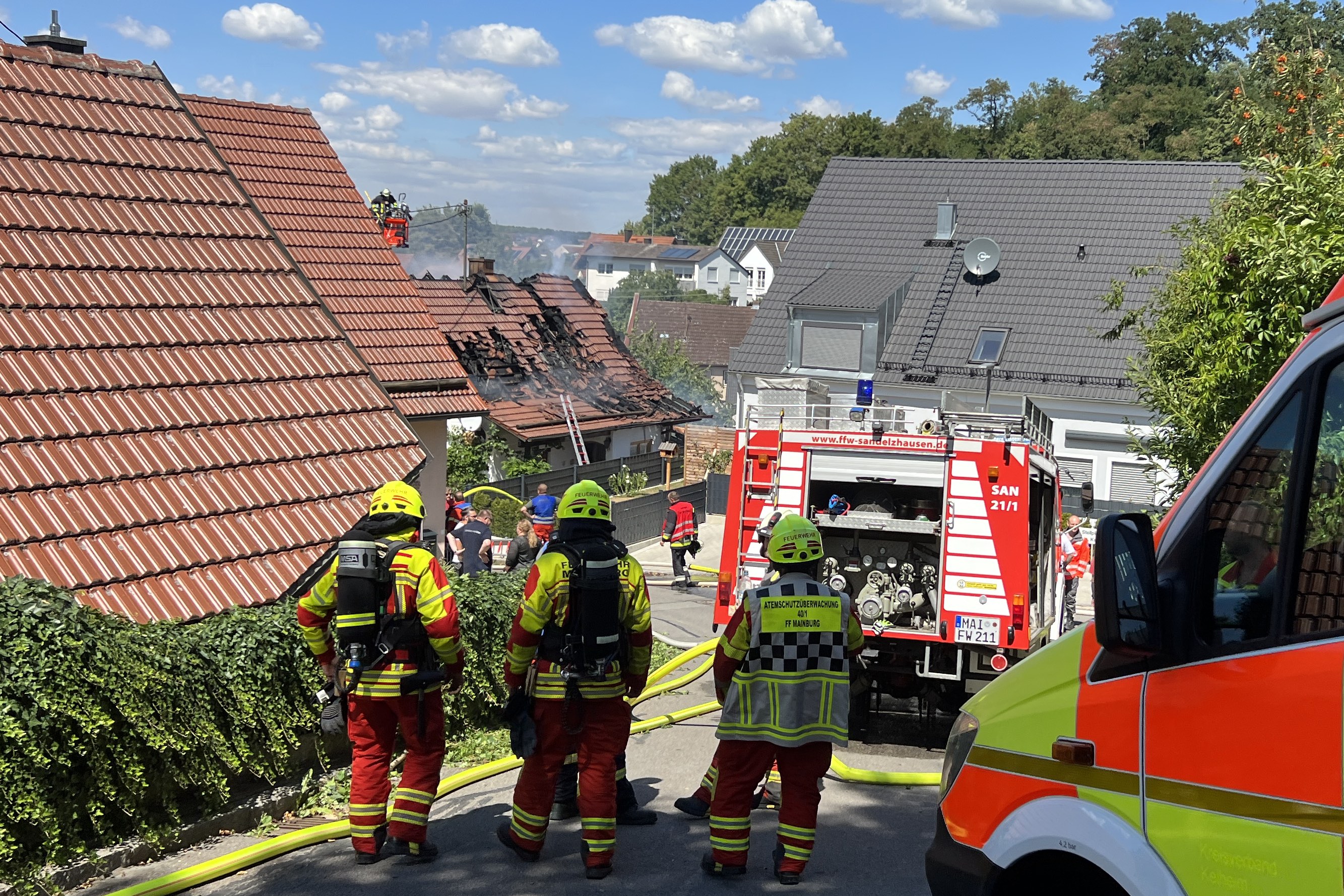 Nach Angaben der Polizei war kurz vor 11 Uhr über die integrierte Leitstelle das Feuer gemeldet worden, das möglicherweise auf zwei angrenzende Gebäude überzugreifen drohte. Zahlreiche Einsatzkräfte von Feuerwehr, Rettungsdienst und Polizei rückten an dem im Vollbrand stehenden Haus an der Straße "Sandelzhauser Gangsteig" an. Durch den raschen Einsatz der Floriansjünger habe ein Übergreifen der Flammen verhindert werden können, meldet die Polizei.