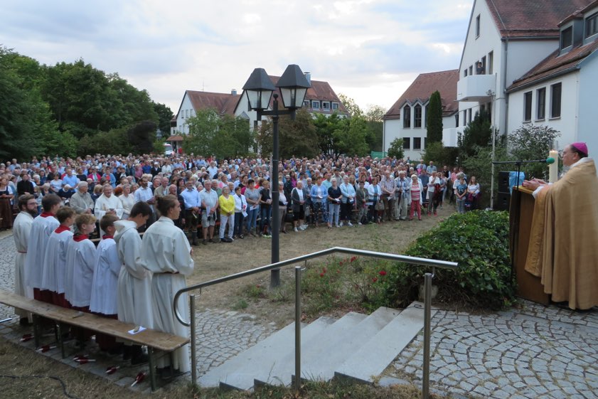 (pba) Zu "Mariä Himmelfahrt", dem Fest der Aufnahme Mariens in den Himmel, hat Bischof Bertram Meier zwei feierliche Pontifikal-Gottesdienste gefeiert: am Vormittag in der Gebetsstätte in Wigratzbad sowie am Abend in der Oase Steinerskirchen bei Hohenwart. Das Oberhaupt des Bistums Augsburg, zu dem auch Teile des Landkreises Pfaffenhofens gehören, erinnerte dabei an die besondere Rolle Marias, die mit offenen Ohren beherzt Ja gesagt habe zum Leben. Mit einer stimmungsvollen Lichter-Prozession in den Abendstunden klang die Feier zu "Marias Geburtstag für das Ewige Leben" aus. Über 900 Gläubige waren in die Oase Steinerskirchen gekommen. Drei Wünsche an Maria formulierte der Bischof dabei in seiner Festpredigt.
