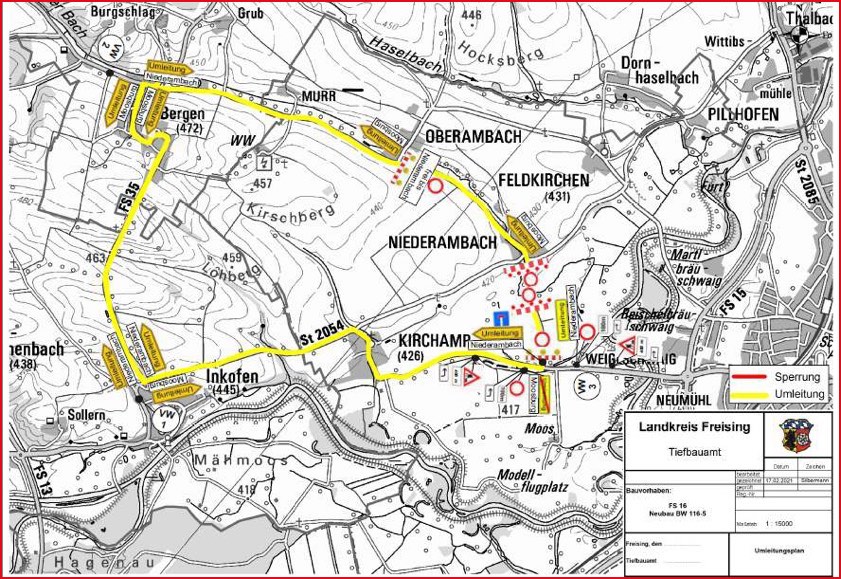 "Während der gesamten Bauzeit bleibt die Kreisstraße FS16 im Bereich des Bauwerks für den gesamten Verkehr gesperrt", heißt es in einer Presse-Mitteilung aus dem Freisinger Landratsamt. Auch Fußgänger und Radfahrer könnten den Ambacher Bach dort nicht überqueren. Der Verkehr aus Moosburg an der Isar nach Niederambach werde auf der Staatsstraße 2054 nach Inkofen, Bergen und Oberambach geleitet. Analog erfolge die Umleitung für den Verkehr aus Richtung Westen. Die Umleitungs-Route sei ausgeschildert. (Grafik: Landratsamt Freising)